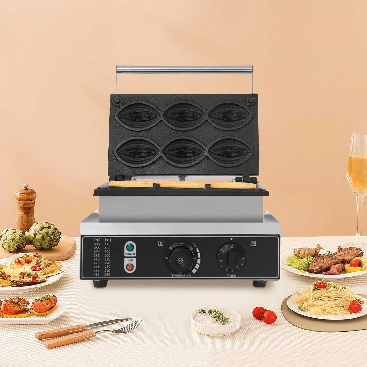 • Application:This product can be widely used in bakeries, restaurants, kiosks, canteens, snack shops, roadside stalls, etc., to make various waffles, sandwiches, eggs, potato cakes, French-baked bread, cream pies, etc.