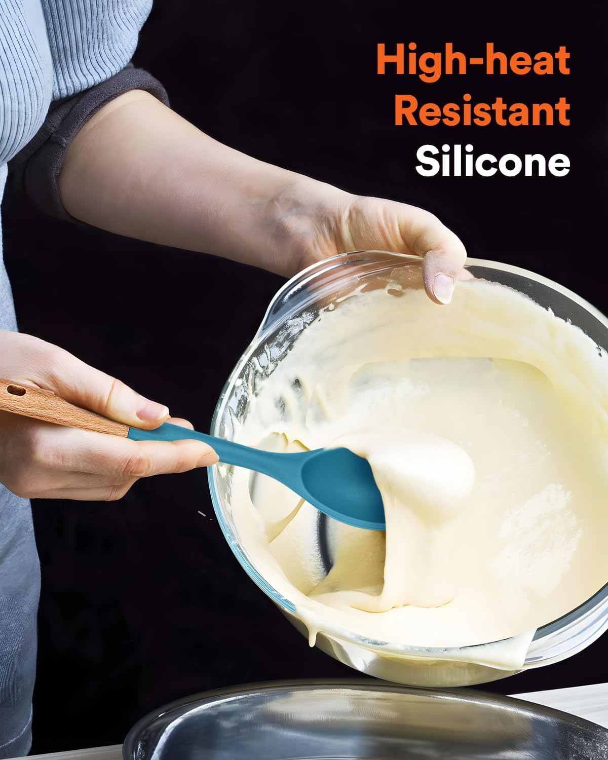 Large Silicone Cooking Spoons, Nonstick Solid Wooden Handle Spoon, Heat Resistan Silicone Kitchen Spoons for Cooking, Serving, Basting, Mixing, 13.2inch (BLUE)