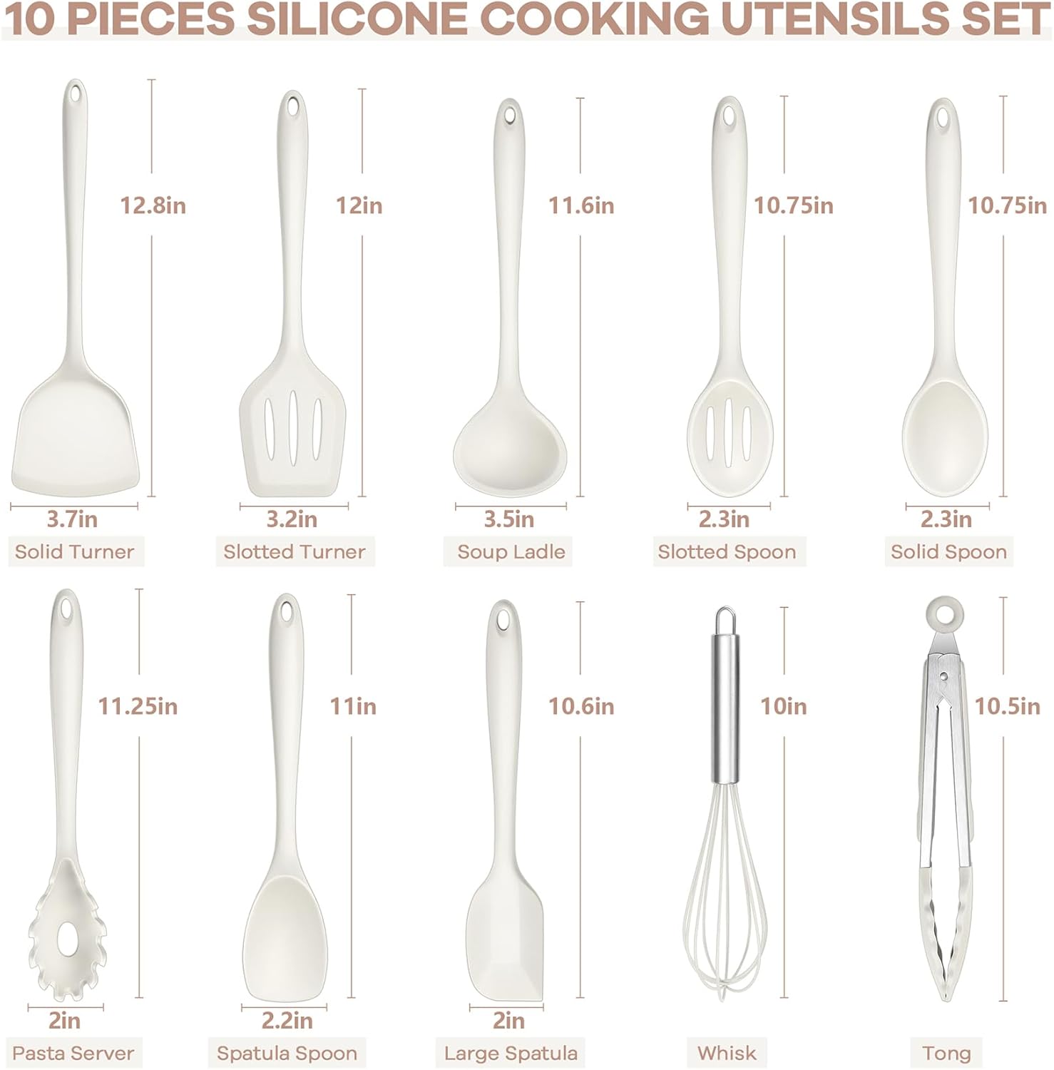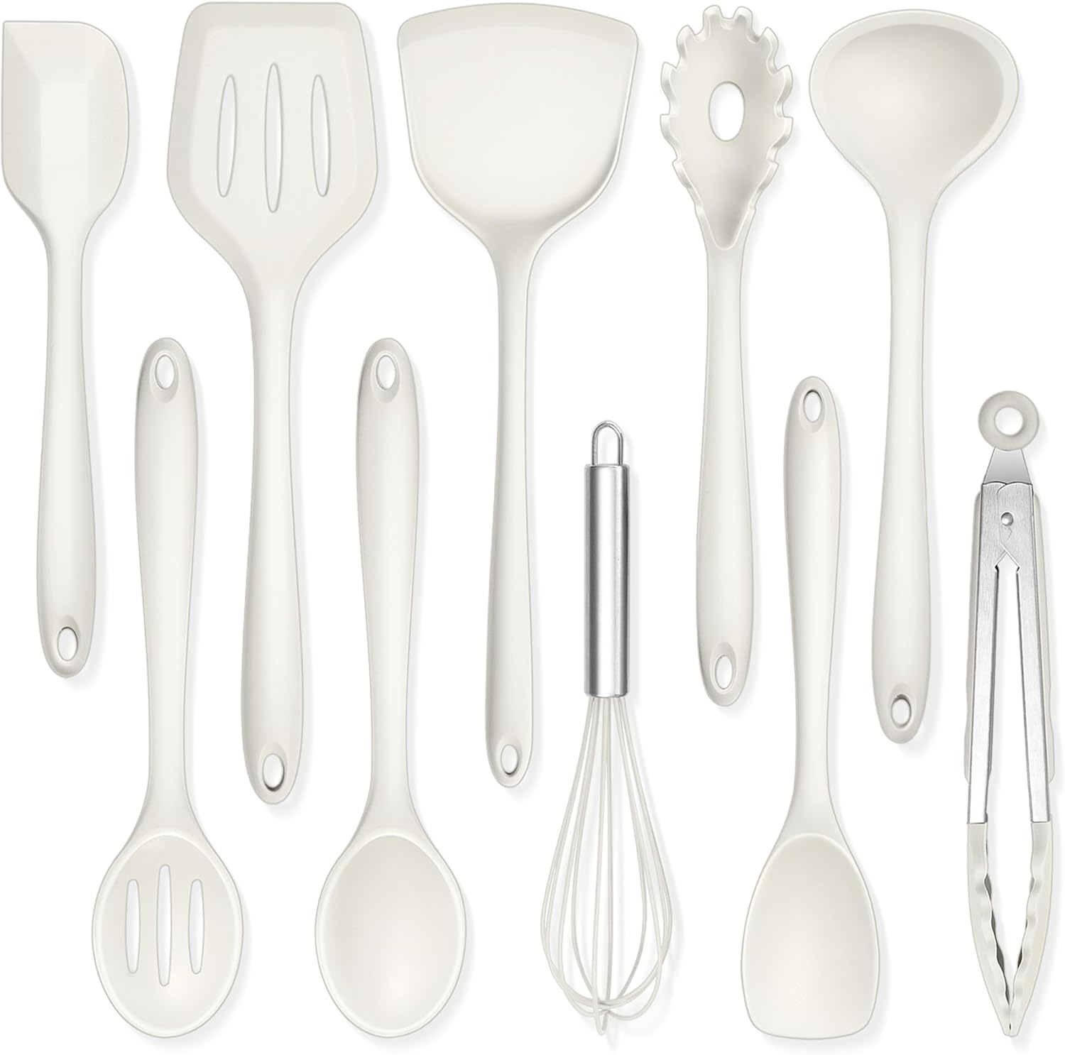 TeamFar Kitchen Cooking Utensils, 10 pcs Silicone Cooking Utensils Set, 446°F Heat Resistant Kitchen Gadgets Tools Set w/Spatula, Turners, Spoons, Soup Ladle, Pasta Server for Nonstick Cookware, White