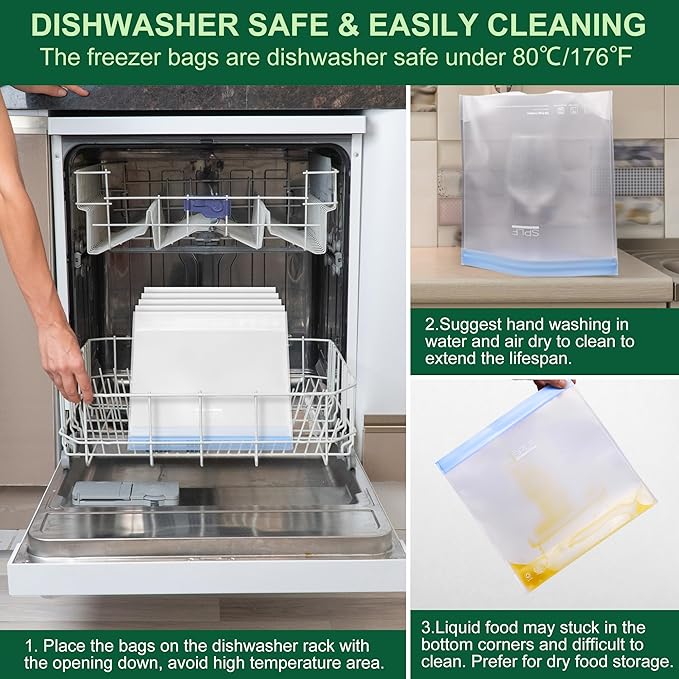 • Freezer & Dishwasher Safe: With heat resistance from -50℃/-122℉ to 80℃/176℉ , the freezer bags silicone can lock out freezer burn while keeping food fresh and full of taste, perfect for freezing meat, chicken, fish, fruits and vegetable. Upgraded PEVA material that is dishwasher safe. however, please skip high-temperature functions such as the dishwasher's drying to extend the lifespan of the gallon bag. We suggest alternating hand wash and air dry to clean for long-term usage. Not microwave friendly.