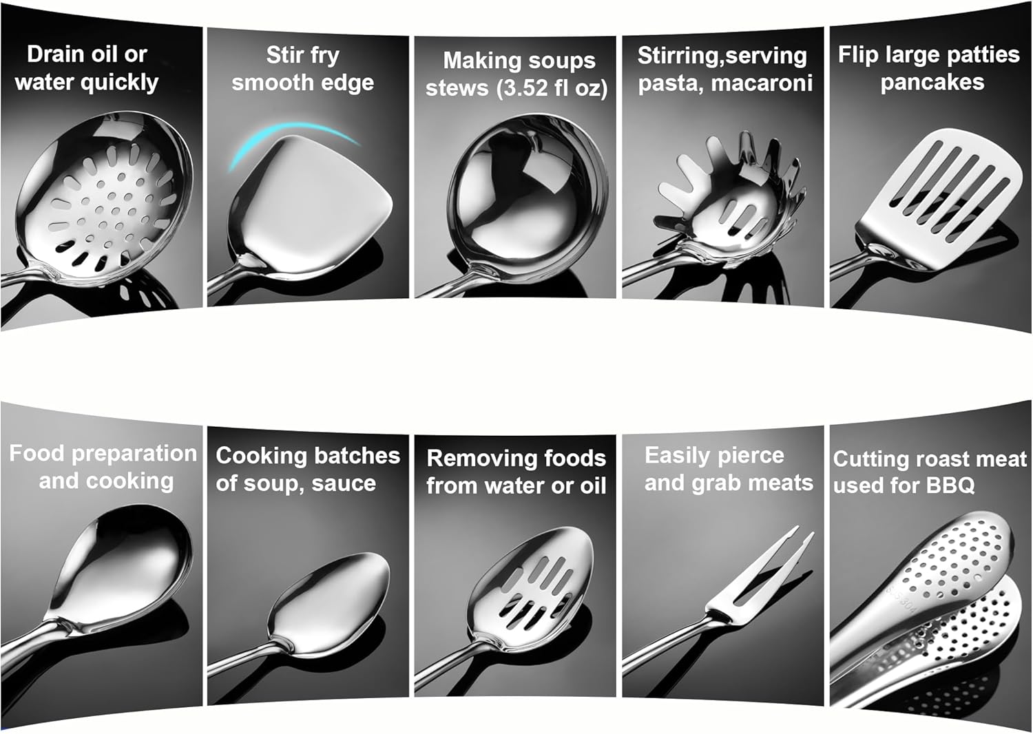 • 【High Quality All Metal Cooking Utensils Set】: Made of food-grade heavy duty 304 stainless steel, forged in 1-piece, sturdy and anti-rust. Very clean lines, good weight and balance, comfortable grip, ergonomic design.