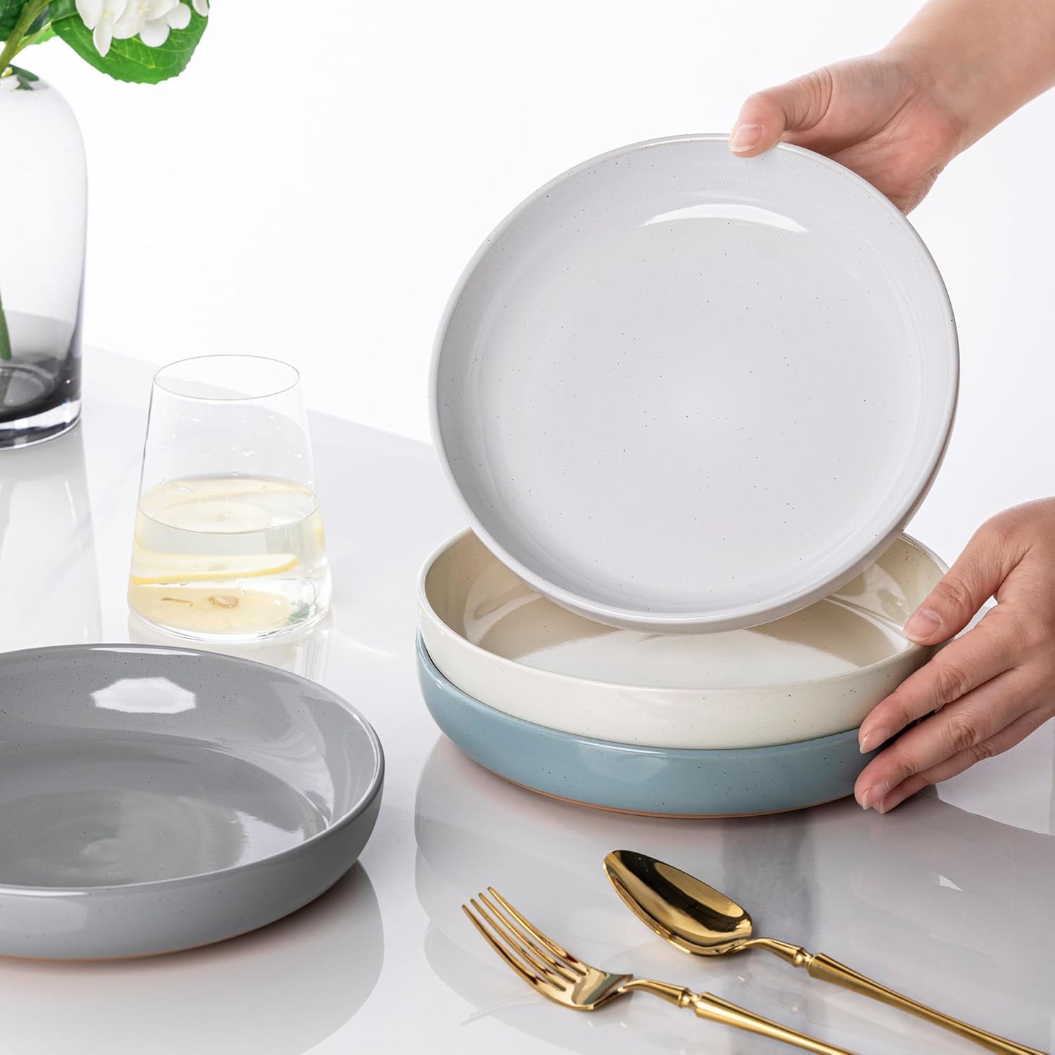 • UNIQUE DESIGN WITH WAVE RIM:These Pasta Bowls are designed by professional artist,The beautiful speckled glaze feels comfortably, It looks fantastic on the table and brightens up your kitchen. It perfect for daily using and special occasion.