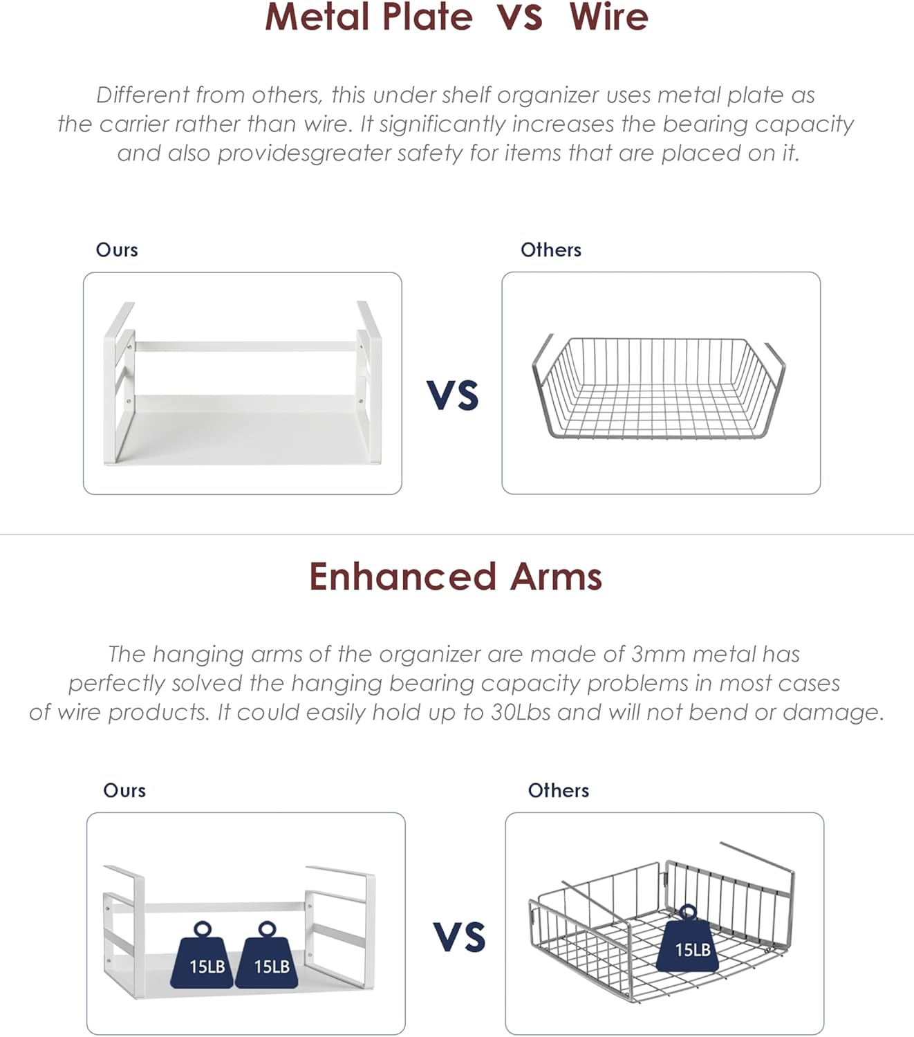 • Great Structure: It could hold up to 30Lbs due to this under shelf basket uses metal plate instead of flimsy iron wire, which vastly enhance its bearing capacity. Thickened hanging arms uses 3nm metal increase the whole stability of basket, prevent it from falling. It has rust-proof coating. It’s heavy duty and for lifetime of use.