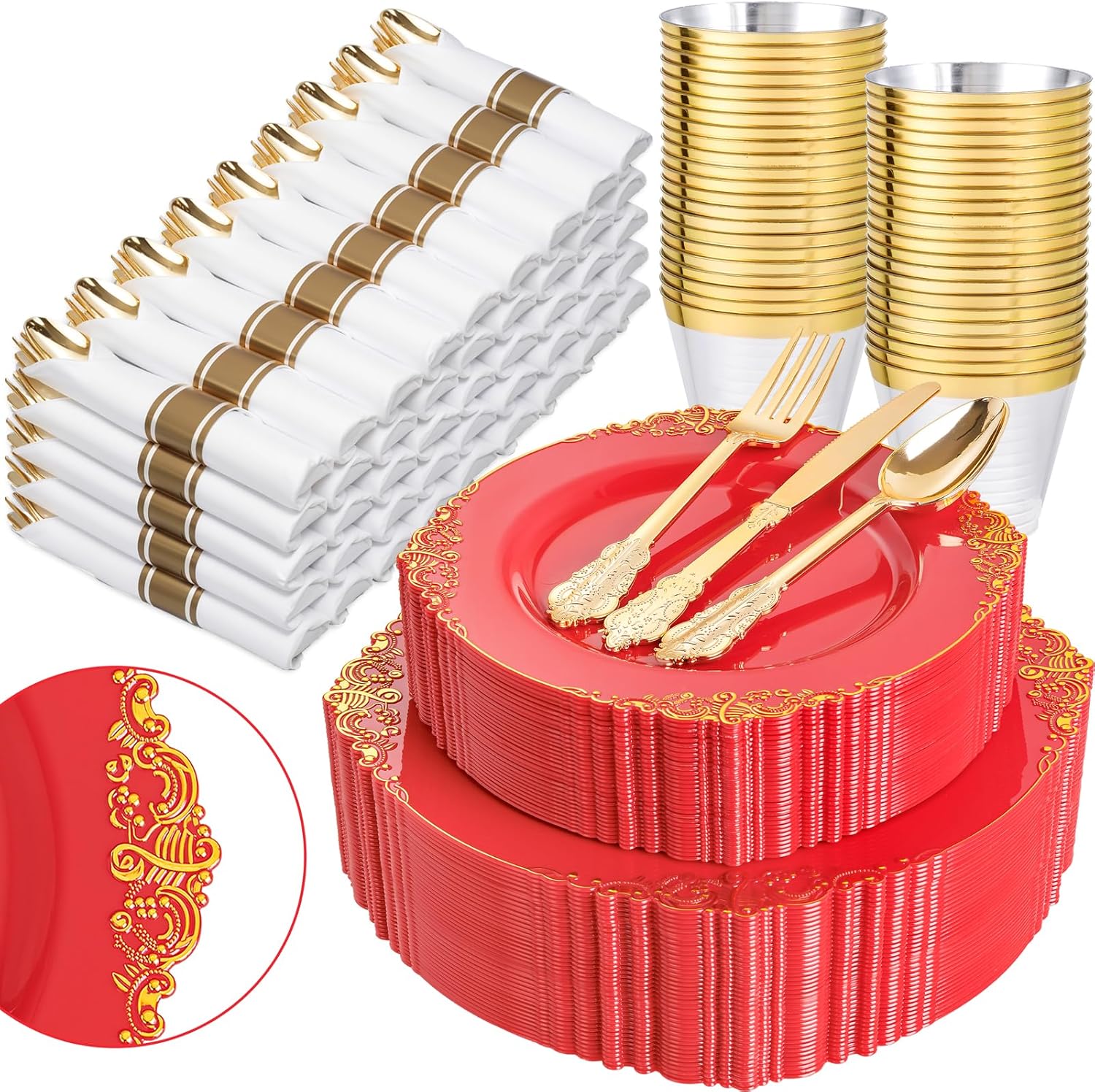 • Serves for 50 Guests - This red and gold plates set includes 50 dinner plates, 50 dessert plates, 50 cups, 50 napkins, and 150 pieces of silverware (50 knives, 50 forks, and 50 spoons), making it ideal for gatherings of up to 50 Guests