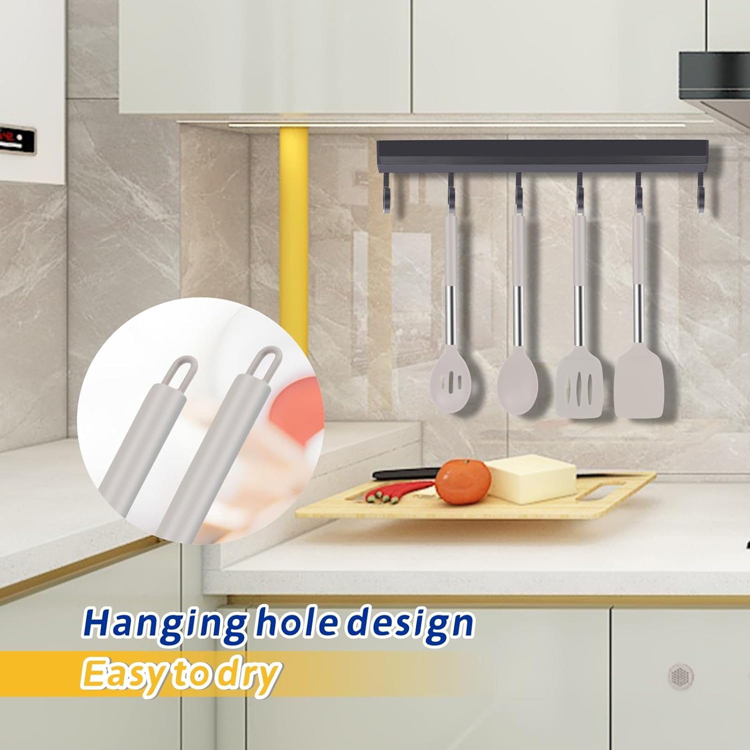 • The set includes: 13.7-inch slotted shovel, 13.7-inch solid shovel, 13.4-inch slotted spoon, 13.4-inch solid spoon and a 7.9-inch non-adhesive hook storage rack for multiple style items perfect for creating delicious food in the kitchen