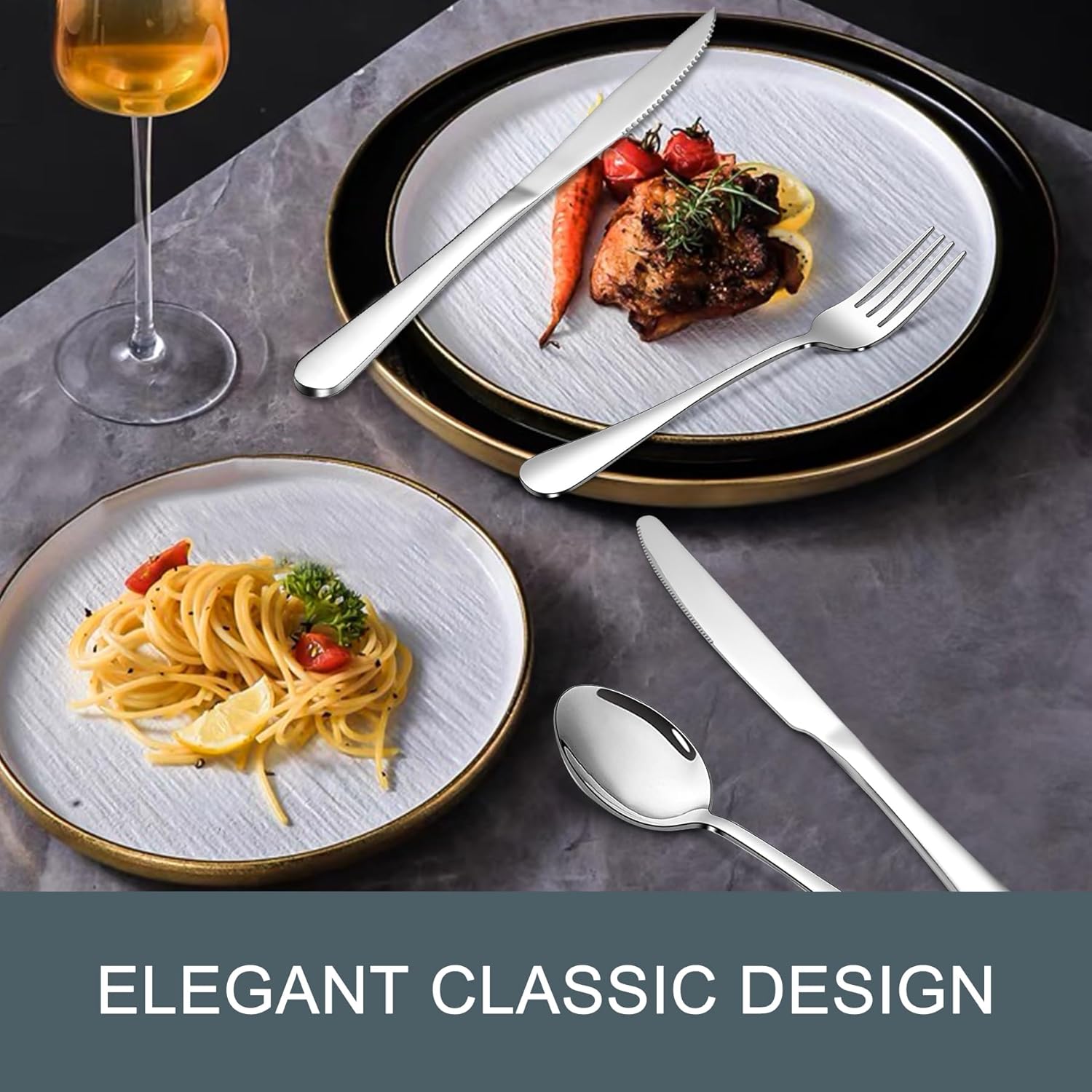 • COMPLETE SET: 20-piece flatware set includes 4 each of dinner forks, salad forks, dinner spoons, teaspoons, and dinner knives for a full table setting