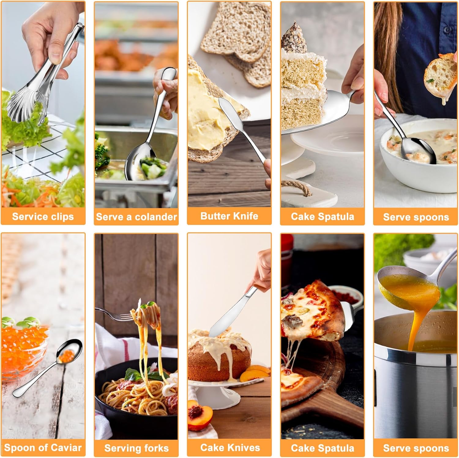 • COMPLETE SET: 10-piece stainless steel serving set includes serving spoons, forks, tongs, soup ladle, and pie server for comprehensive dining needs