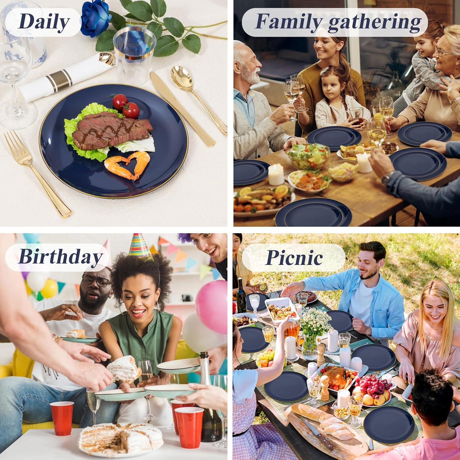 KIRE 350Pcs Blue and Gold Plates -Heavy Duty Navy Blue Dinnerware Set - 100 Plastic Plates 50 Pre Rolled Napkins with Gold Plastic Silverware 50 Cups for Upscale Birthday/Wedding/Parties
