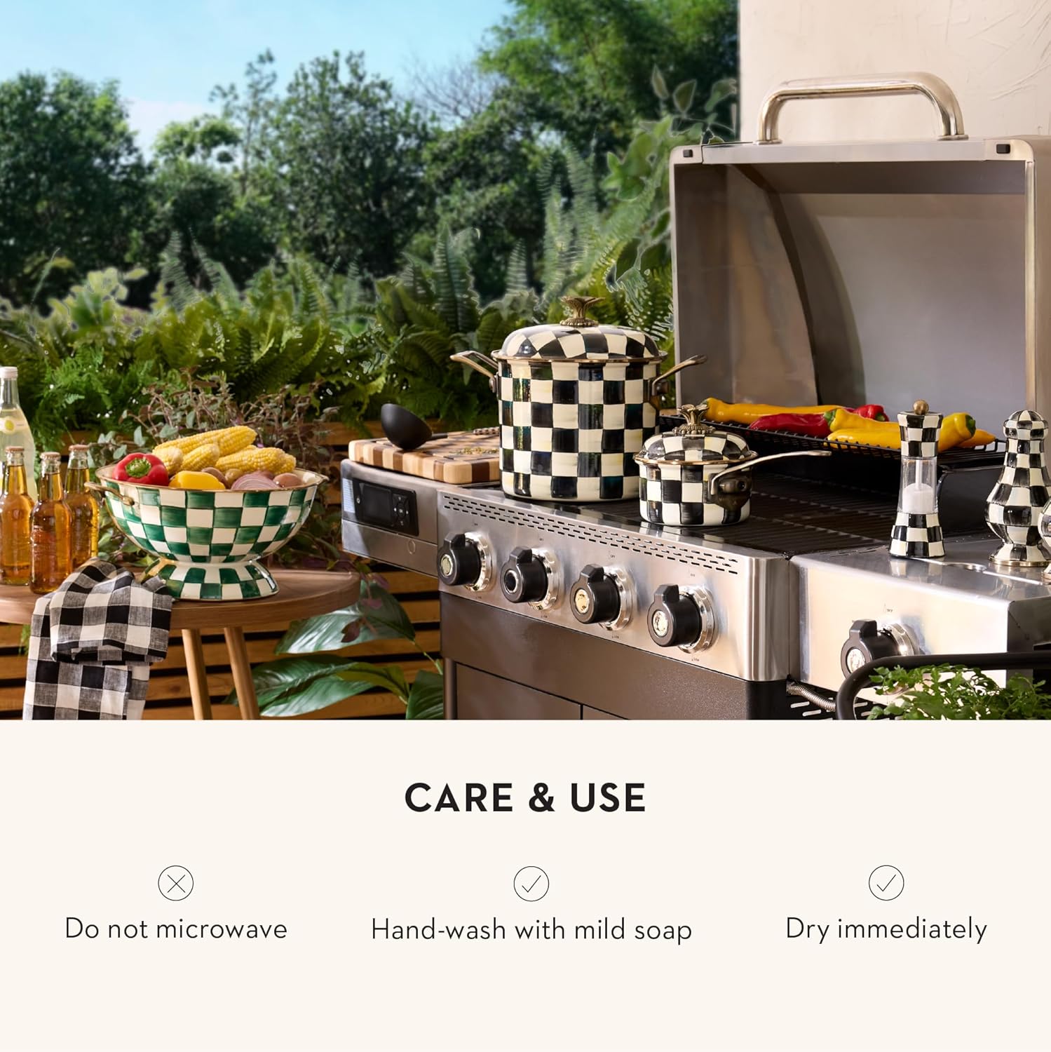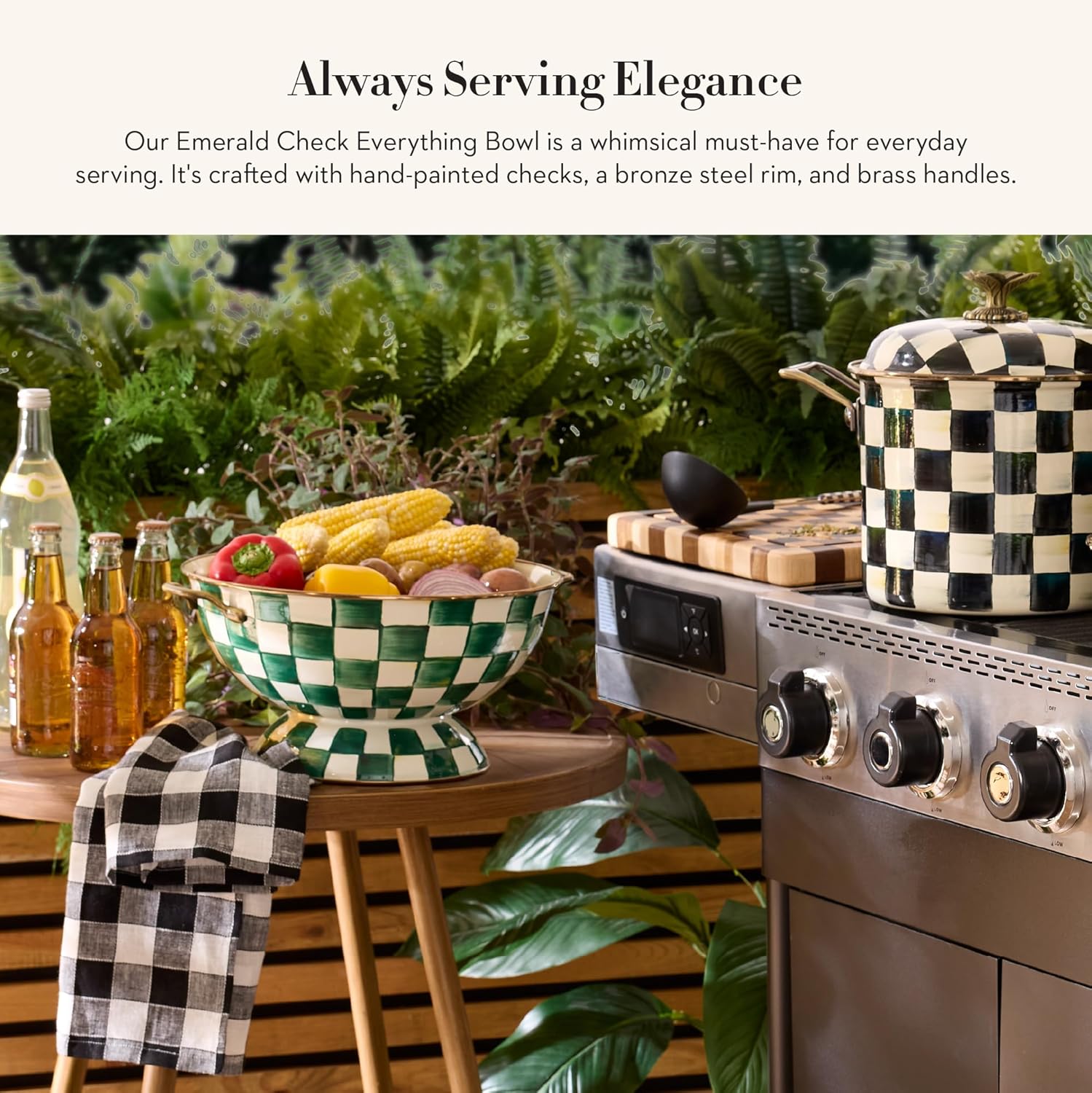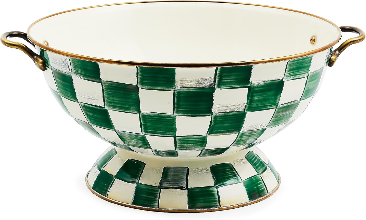 • ENTERTAINING ESSENTIAL: Elevate any meal with this Emerald Check enamelware bowl. It features a hand-glazed heavy-gauge steel underbody decorated with glossy hand-painted green-and-white checks and has a bronzed stainless-steel rim.