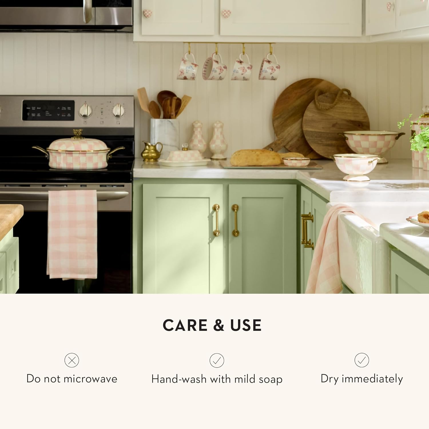 • ENTERTAINING ESSENTIAL: Elevate any meal with this Rosy Check enamelware bowl. It features a hand-glazed heavy-gauge steel underbody decorated with glossy hand-painted pink-and-white checks and has a bronzed stainless-steel rim.