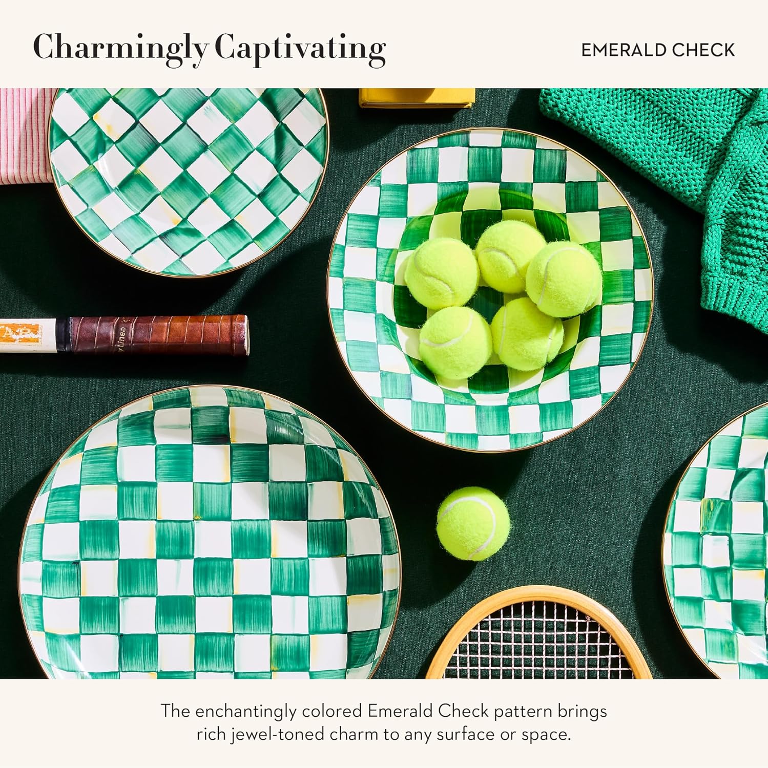 • ENTERTAINING ESSENTIAL: Elevate meals with the Emerald Check large serving bowl featuring enchanting hand-painted color-dragged green-and-white checks. It has a hand-glazed heavy-gauge steel underbody and a bronzed stainless-steel rim.