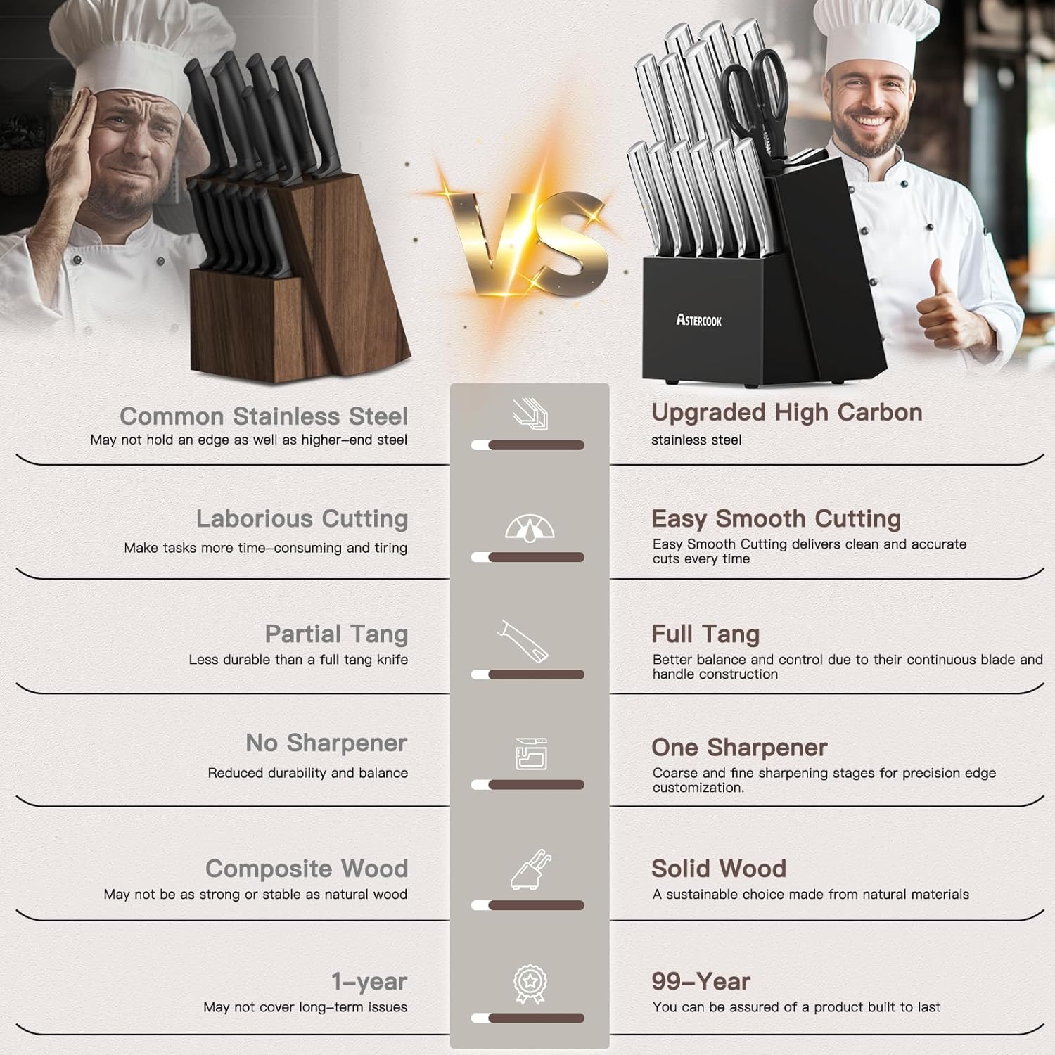 Astercook Knife Set Kitchen with Block and Sharpener Full Tang 15 Pcs Premium Stainless Steel Knives Dishwasher Safe Utensils Set with Ultra Sharp Blade and Anti-slip Ergonomic Handle, Elegant Black