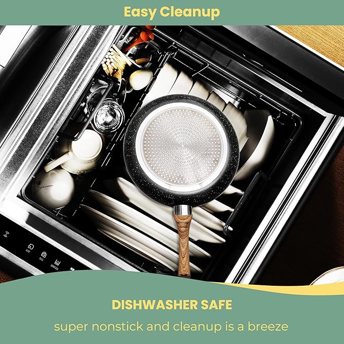 • Heavy-Duty 2.5mm Stretched Aluminum: Premium 2.5mm thick core resists warping at 450°F/230°C – even heating for perfect searing in this frying pans nonstick 12 inch. The bakelite handle of the skillet features woodgrain design, and it is comfortable to grip and stays cool while cooking