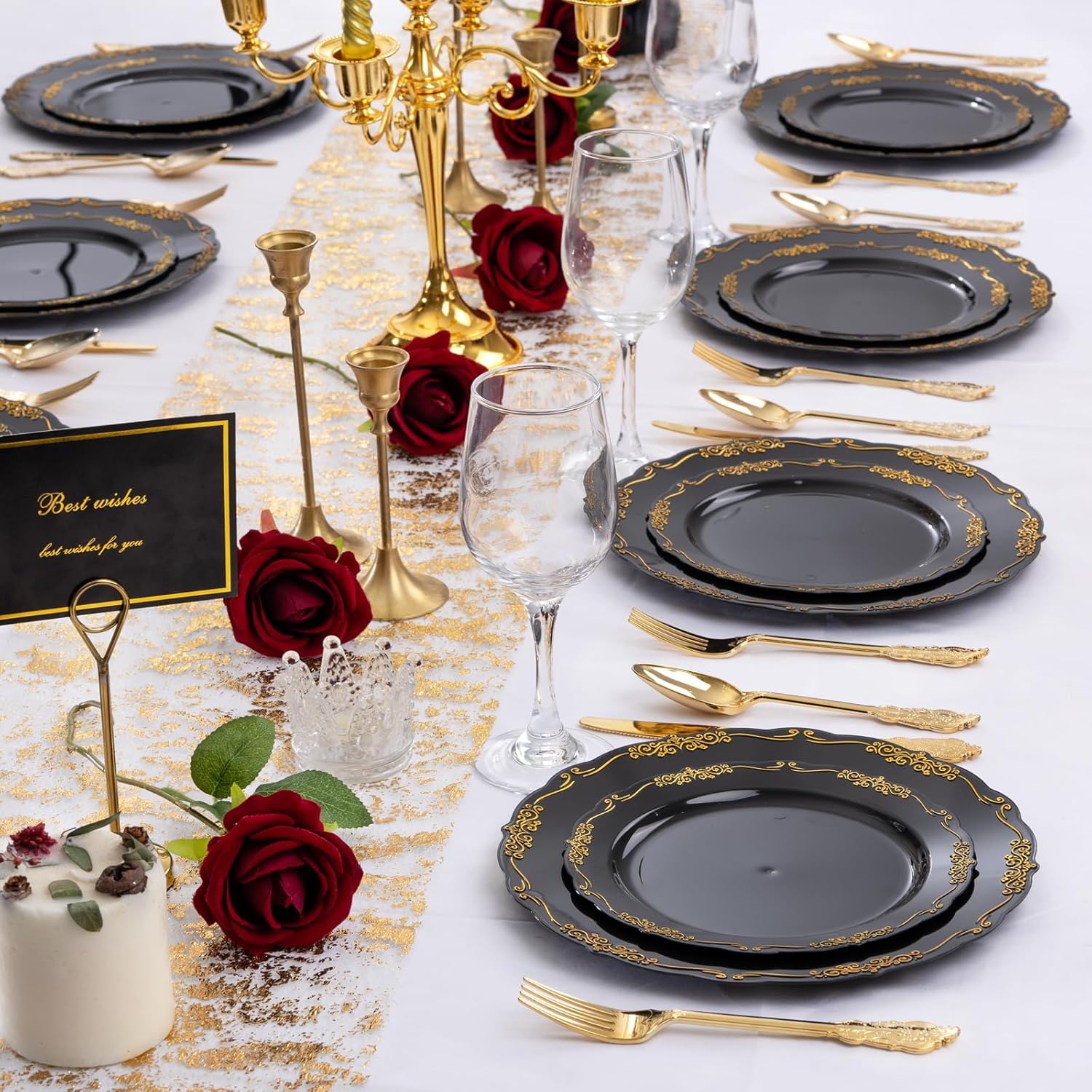 • Value Pack: This value pack includes 30 black dinner plates 10inch, 30 black dessert plates 7.5inch, 30 gold plastic forks, 30 gold plastic spoons and 30 gold plastic knives catering to the dining needs of up to 30 people at once. Whether you're hosting a large party or a small gathering, these black plates set provide a cost-effective and stylish solution for serving meals.