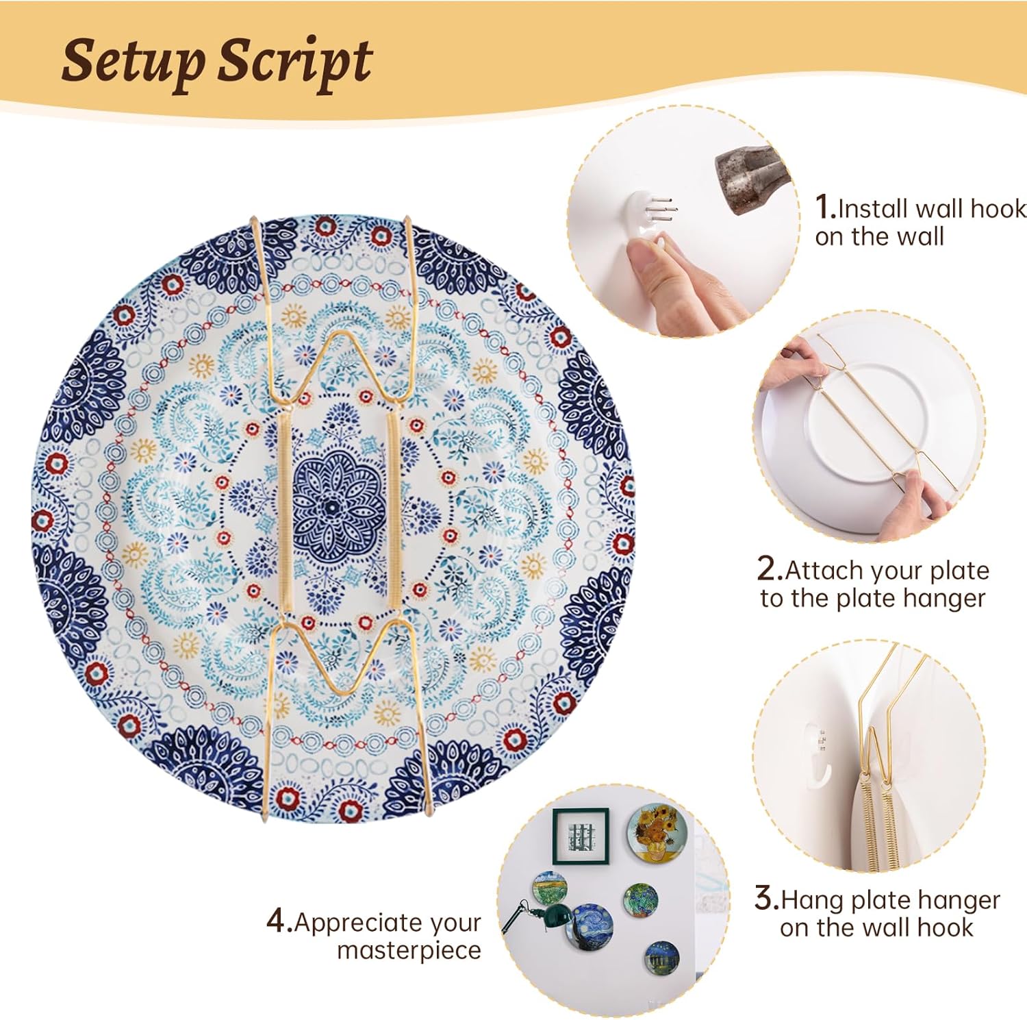 • 【Plate Hangers for the Wall】 You will receive Litray golden wall plate hanger, a matching metal hook, rubber tip protectors, and an instruction sheet. Designed for 9-11 inch decorative plates for wall hanging, it securely holds round or square china, porcelain, or ceramic platters. The golden finish adds elegance, while the spring clamp design ensures a firm grip—please handle with care during installation.