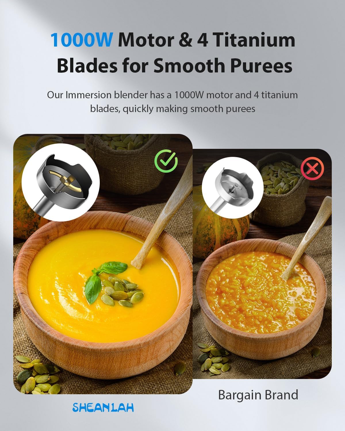 • 【4-Blade Titanium Head】Our immersion blender features a 4-blade titanium head for superior performance. Compared to standard 2-blade designs, it blends more efficiently, This cutting-edge design not only improves blending efficiency but also extends the lifespan of the blades, making it a reliable choice for all your culinary needs.