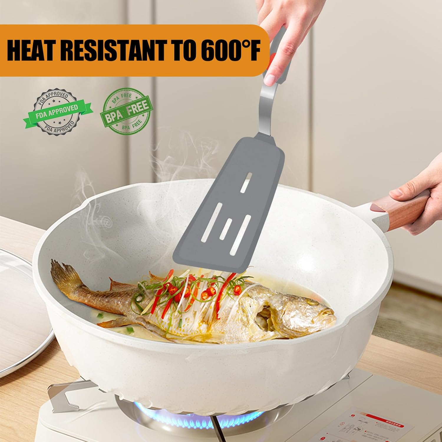 • Flexible but Strong: The flexible silicone head of our silicone spatula turner has a beveled edge that can easily slide under food, and is strong enough to easily lift and flip heavy food, perfectly balancing flexibility and strength
