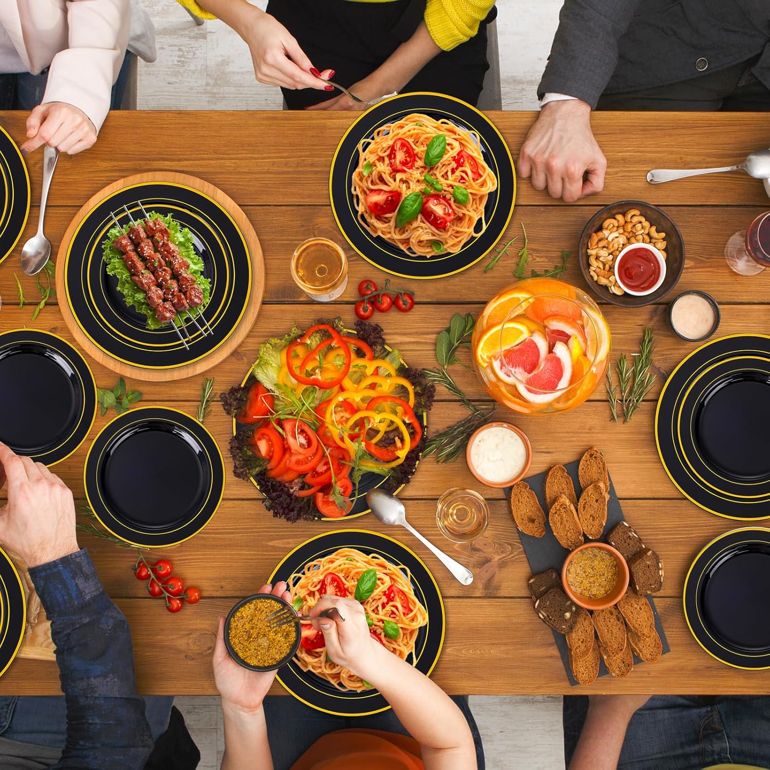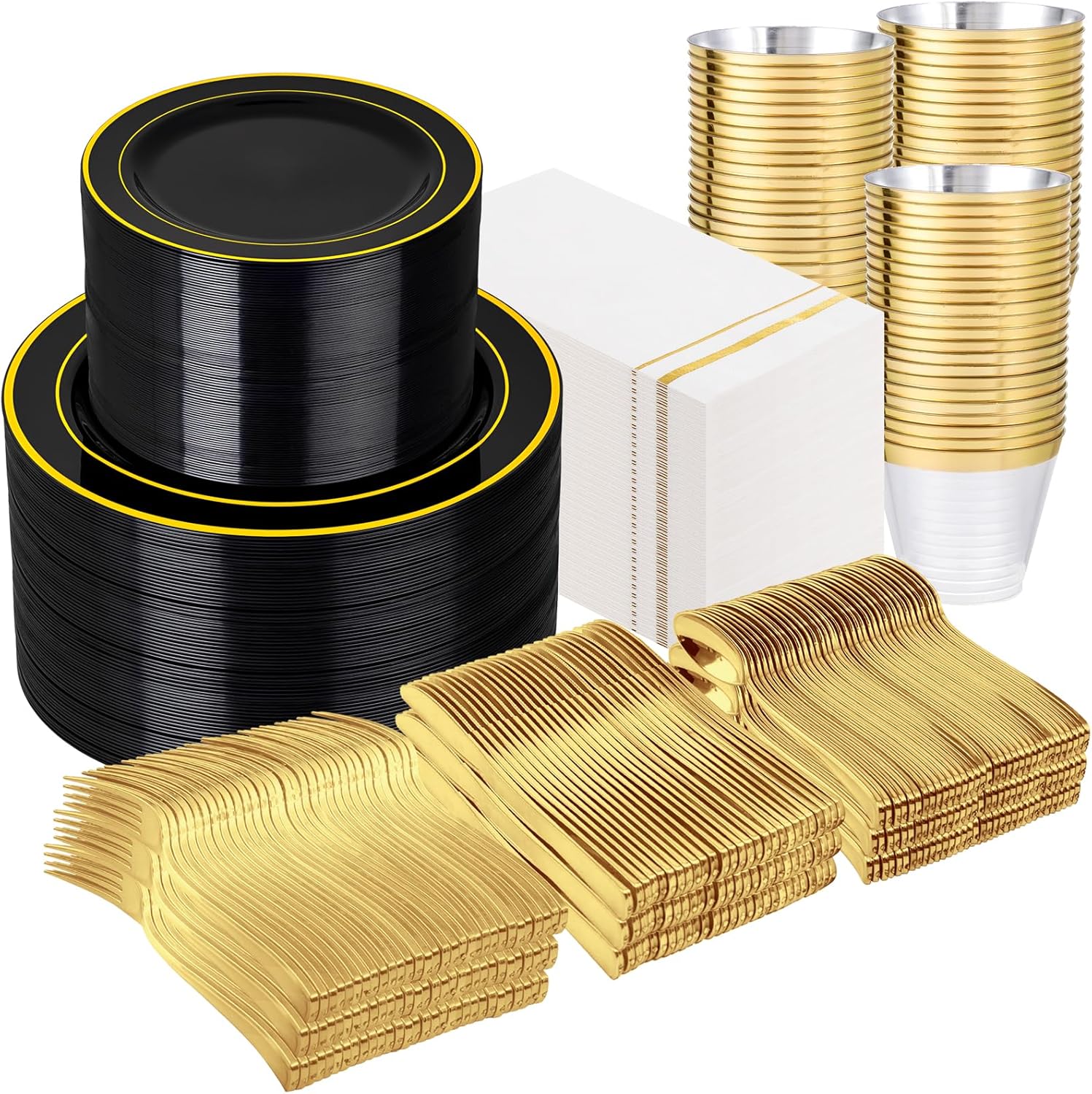 • Elegant Design: Impress your guests with our premium black and gold plastic plates that bring royal sophistication to any gathering. This black dinnerware sets includes 200 Black Plastic Plates with Gold Rim for wedding receptions, birthday bashes, or Halloween party. Our black plastic plates harmonize elegance with resilience. In their presence, every meal becomes an experience, every celebration a masterpiece, and every occasion a testament to the enduring allure of timeless grace.