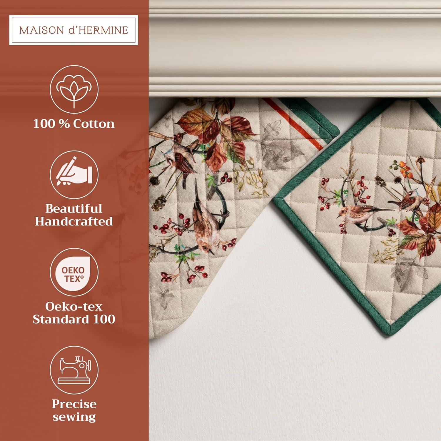 Maison d' Hermine 100% Cotton Oven Mitt & Pot Holder Set (7.5"x13" & 8"x8") Heat Resistant BBQ Cooking Gloves with Loop for Thanksgiving Christmas Decorations Handling Hot Pans (Recolte)