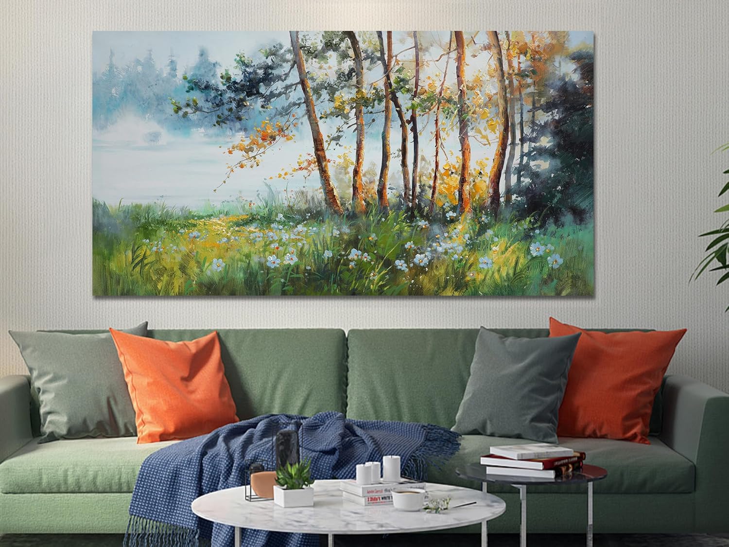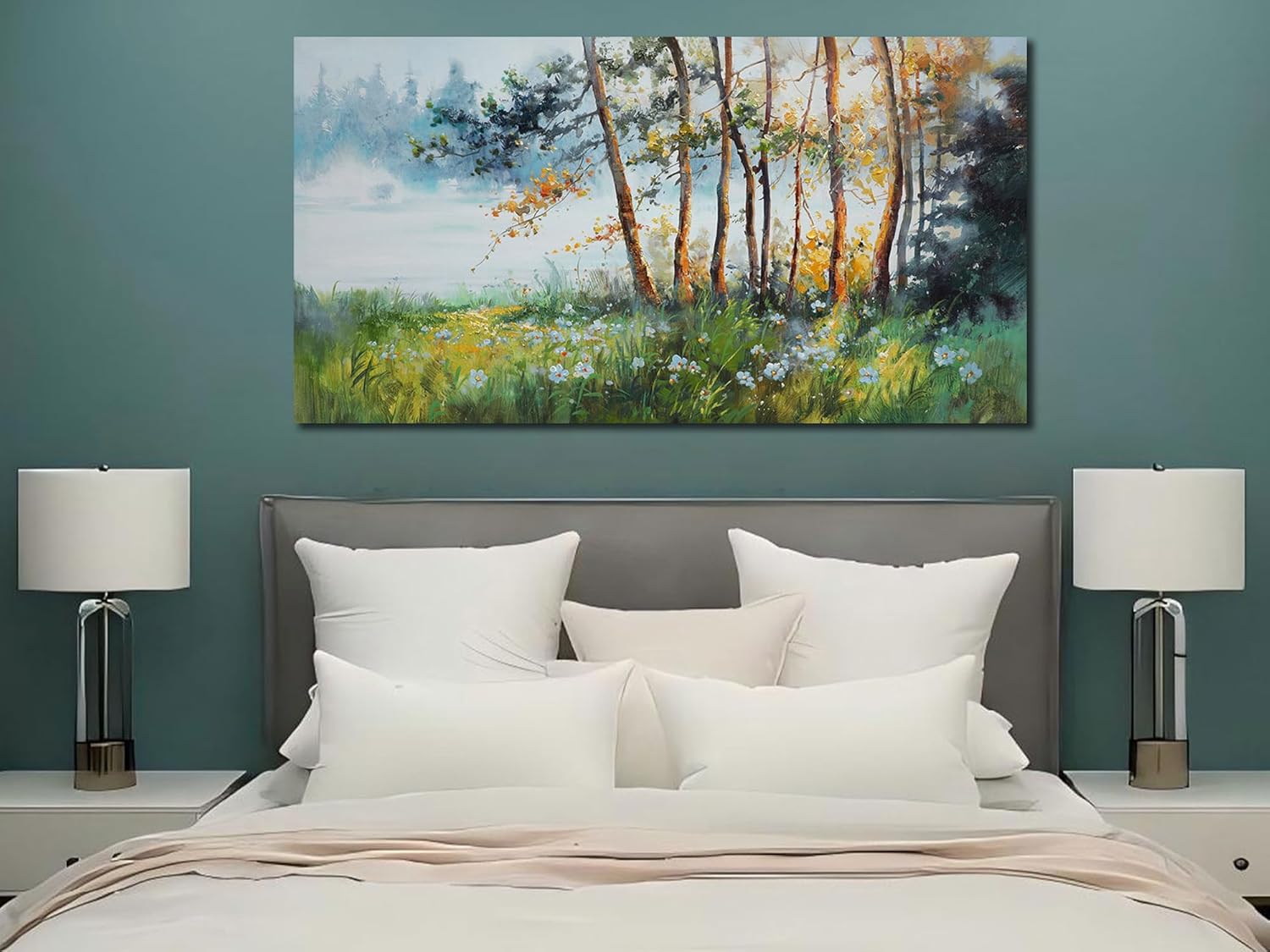 • Nature Forest Wall Art Size: 58inx29in (147cmx74cm) one panel large size with wood grain outer framed ready to hang. This elegant wall art features a vibrant array of colors and hand painted textures will bring a touch of sophistication to any room