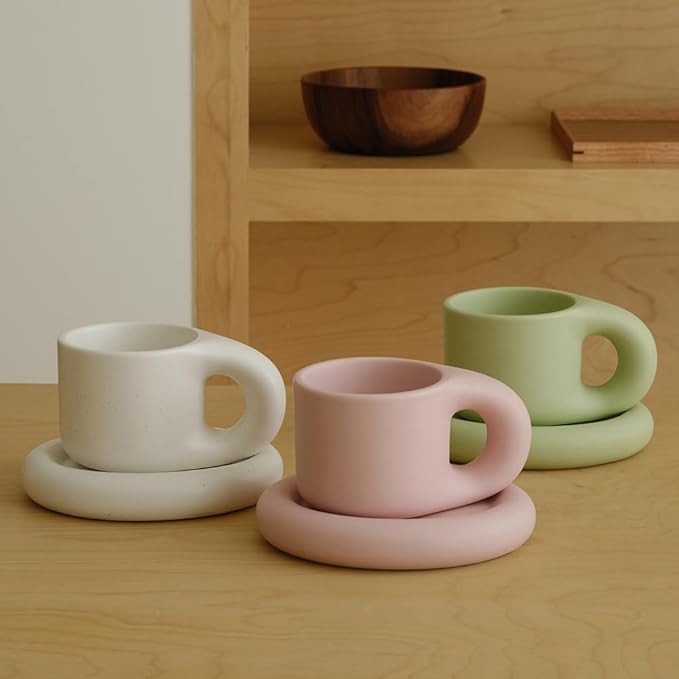 WENSHUO Chubby Funny Coffee Mug, Novelty Cute Cup and Saucer, Matte Crème, 9 oz (Nacre White)