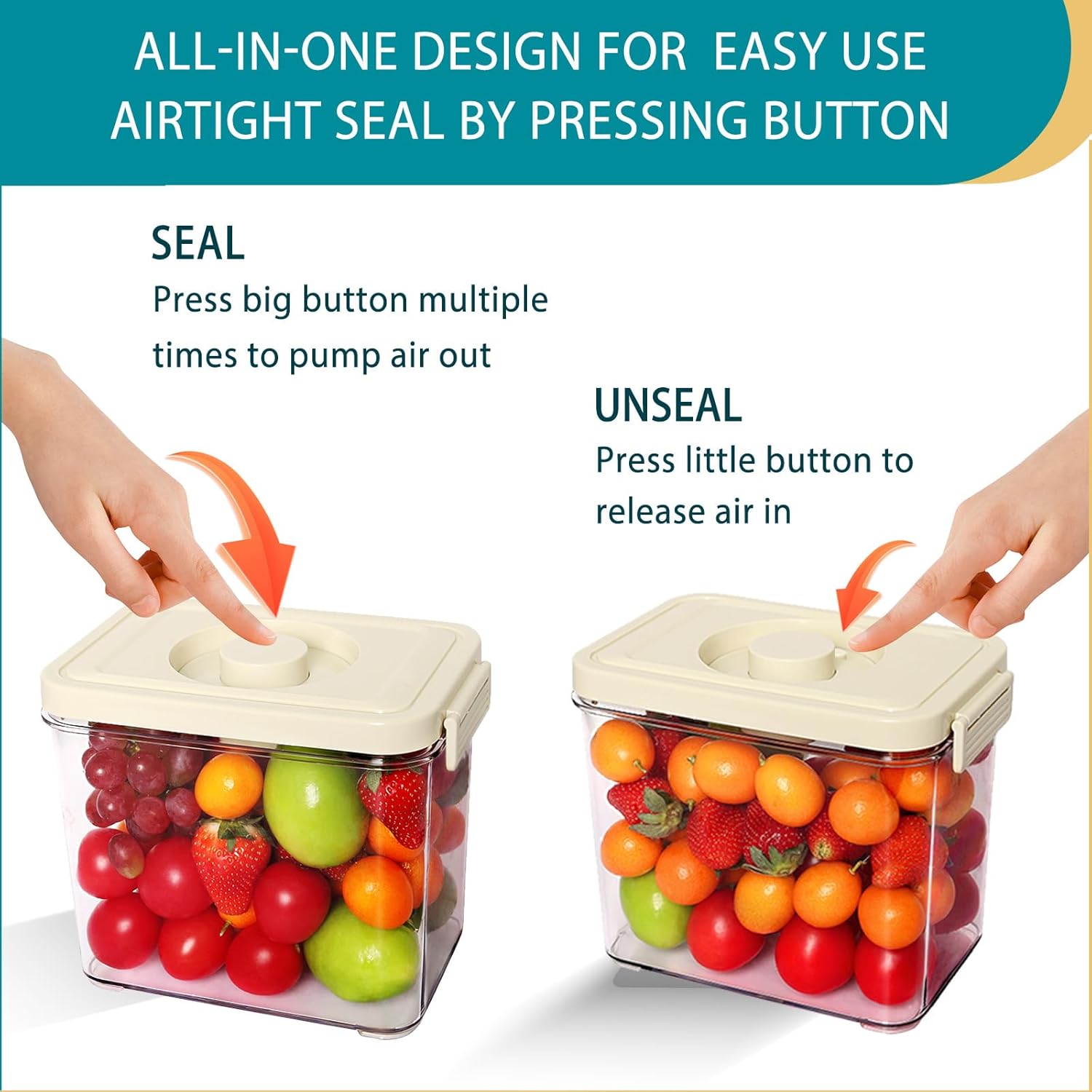 • Triple airtight storage containers: The first seal can achieve by locking the buckle, silicone rubber gasket in lid helps to provide second airtight, press big button multiple times and pump air out to reach airtight state for the third seal, all-in-one design helps to seal the container without other tools, vacuum containers are leakproof, they can help to preserve the aroma of food for 5 times longer than usual