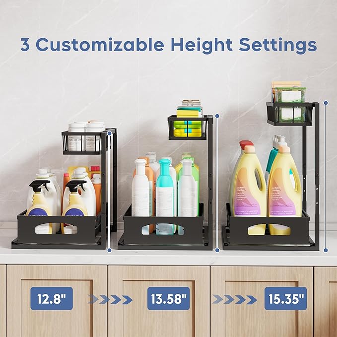 Under Sink Organizer , 2 Pack Height Adjustable Cabinet Organizer with Slide Out Drawer, Pull Out Under Sink Storage, Multi-Purpose 2 Tier Sink Shelves for Kitchen Bathroom Pantry (Black, 2 Pack)