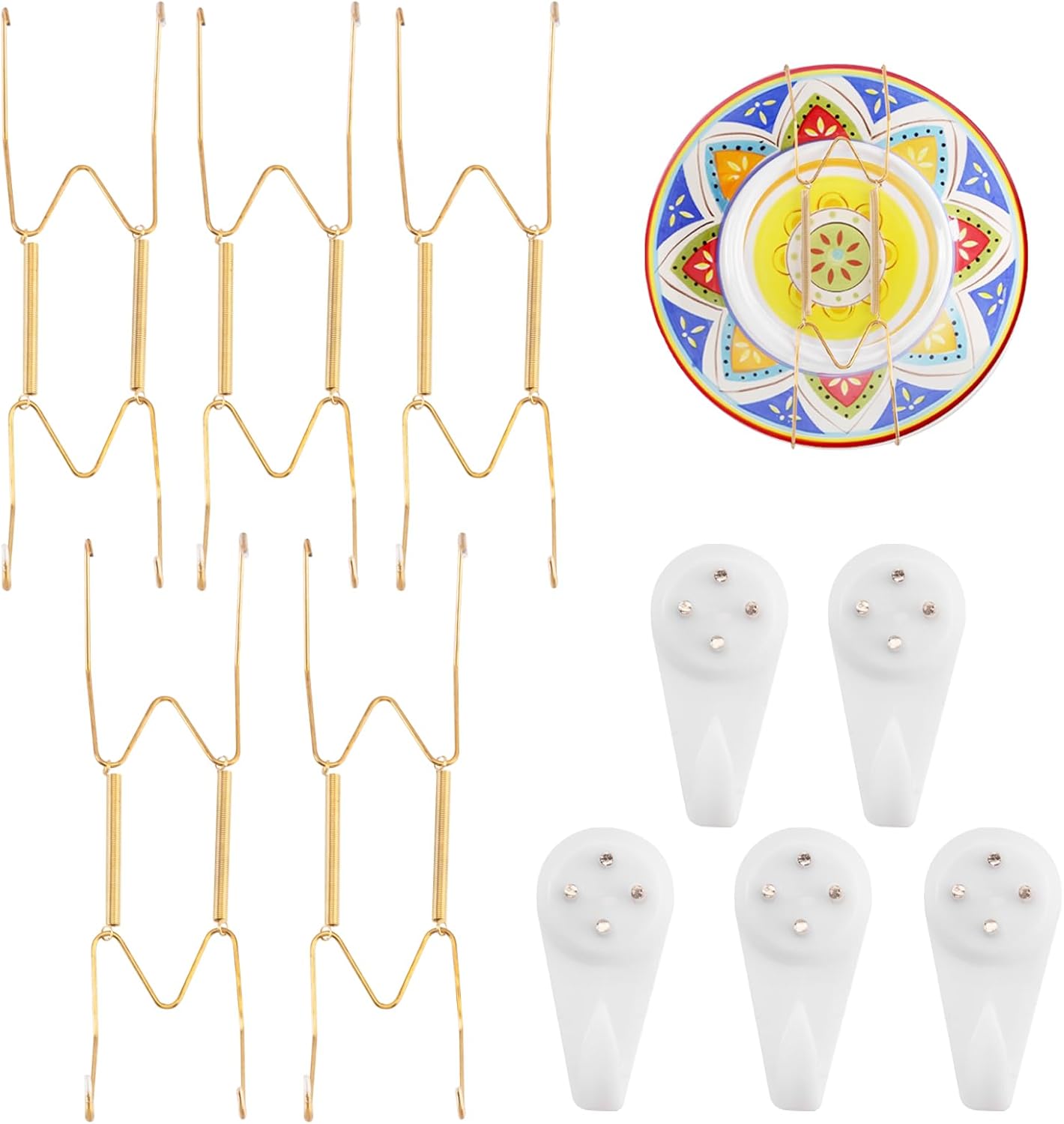 5 Pack Plate Hangers for The Wall Suitable for 8-10 inch Small Decorative Plate, Invisible Stainless Steel Plate Hangers for Display with Wall Hooks, for Plates/Platter/Dish/Picture(Gold)