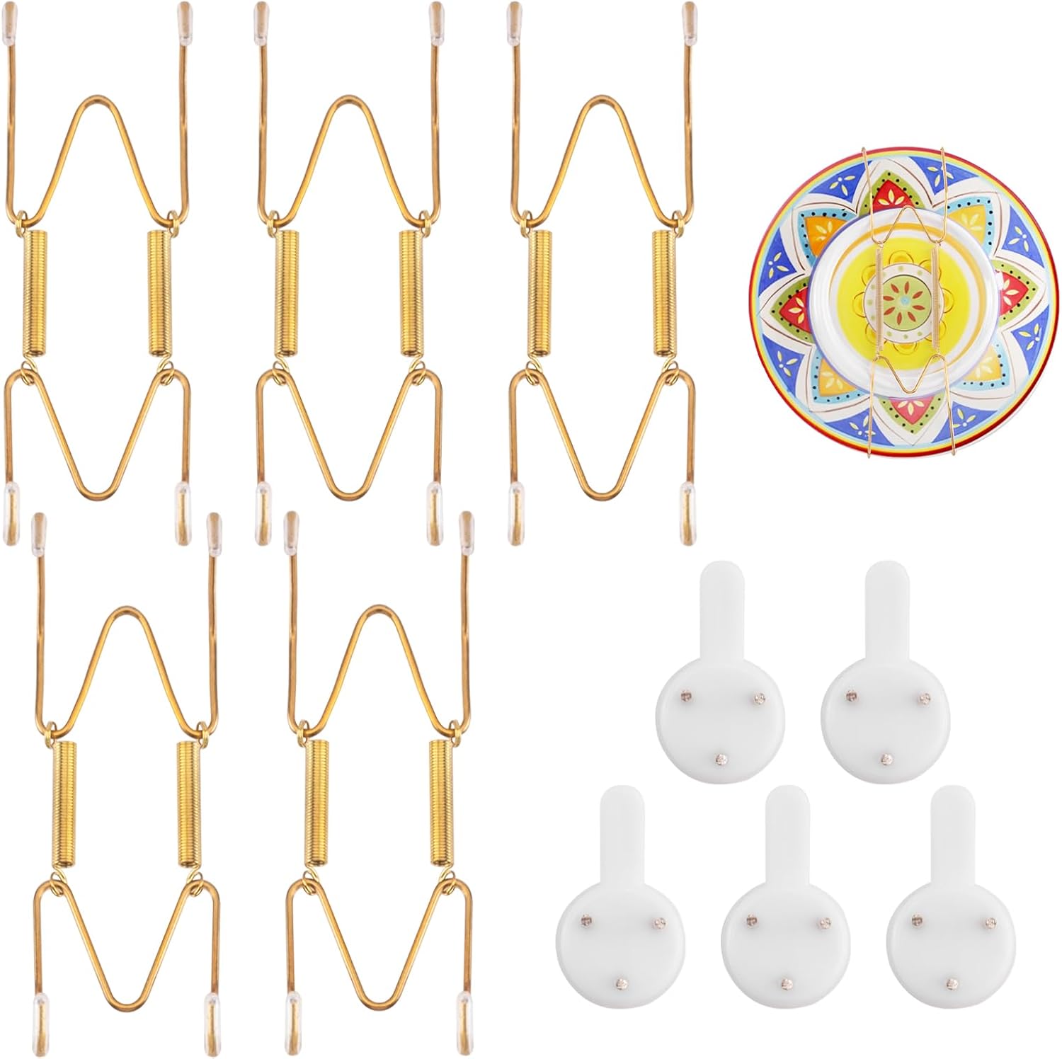 5 Pack Plate Hangers for The Wall Suitable for 4-5 inch Small Decorative Plate, Invisible Stainless Steel Plate Hangers for Display with Wall Hooks, for Plates/Platter/Dish/Picture(Gold)