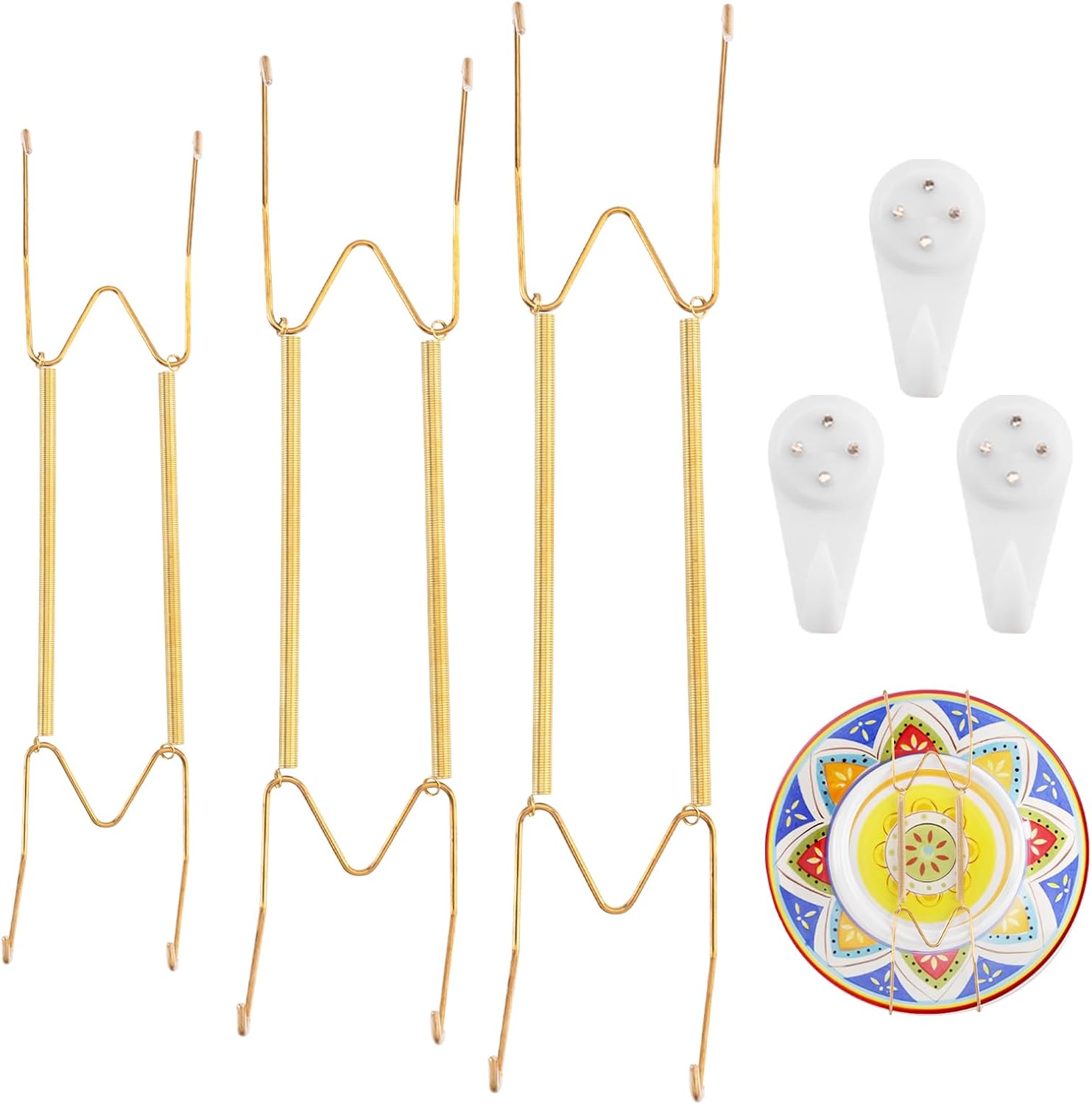 • 【Plate Hangers for The Wall】 You will receive 3 plate hangers in 3 sizes: 1 pcs for 10"-14" plates、1 pcs for 10"-16" plates、1 pcs for 11"-20" plates. Included accessories: 3 wall hooks、12 rubber tip protectors (4 per hanger)、1 instruction manual. Safety Note: These hangers have spring-loaded clamps—handle with care to avoid pinching your fingers.