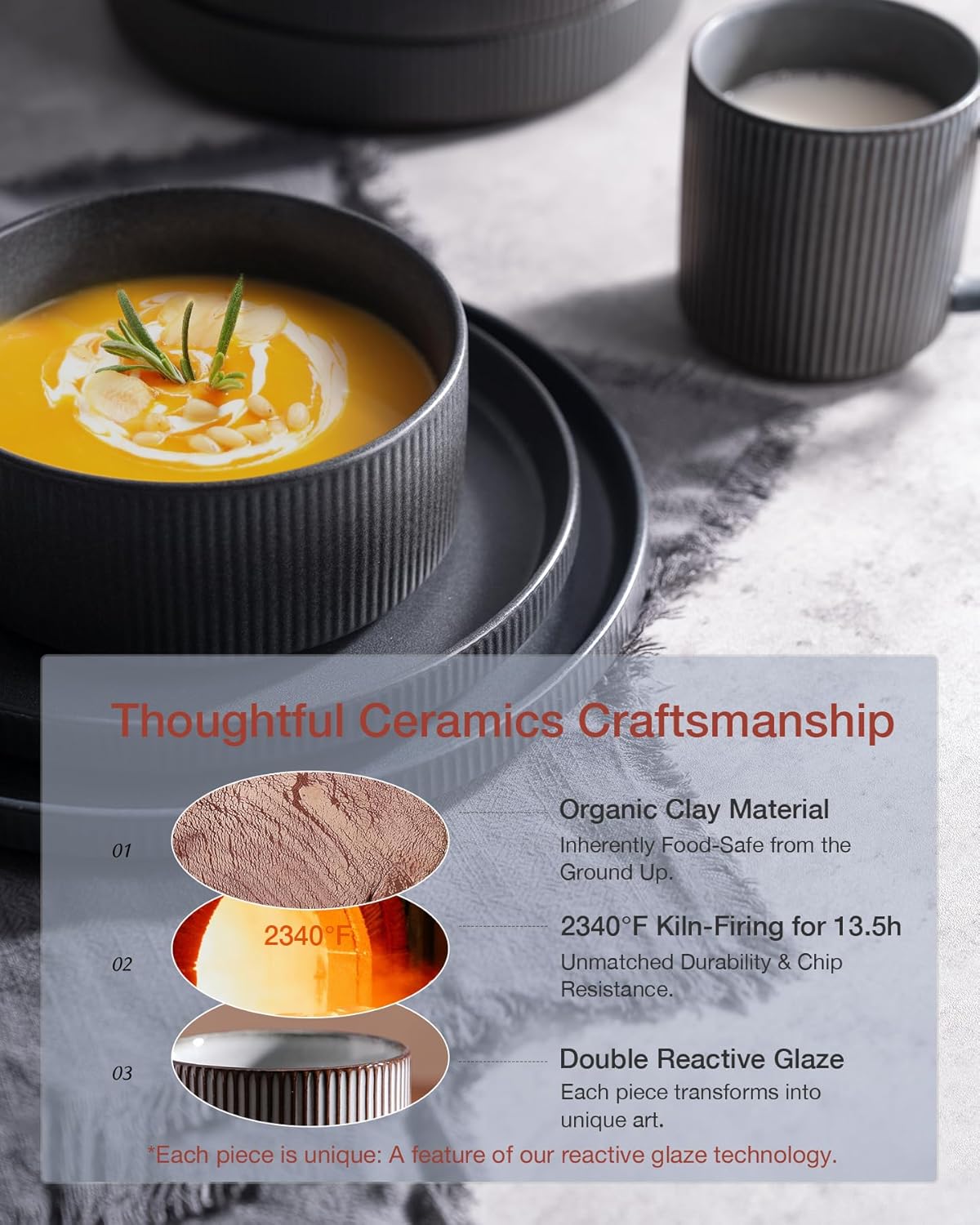 • [Everyday dinnerware]: Our premium stoneware dinnerware crafted from organic and natural clay, is LEAD-FREE and CADMIUM-FREE. It ensures safety for both your family and the environment. You can savor all kinds of meals, including steaks, salads, and desserts, with complete confidence