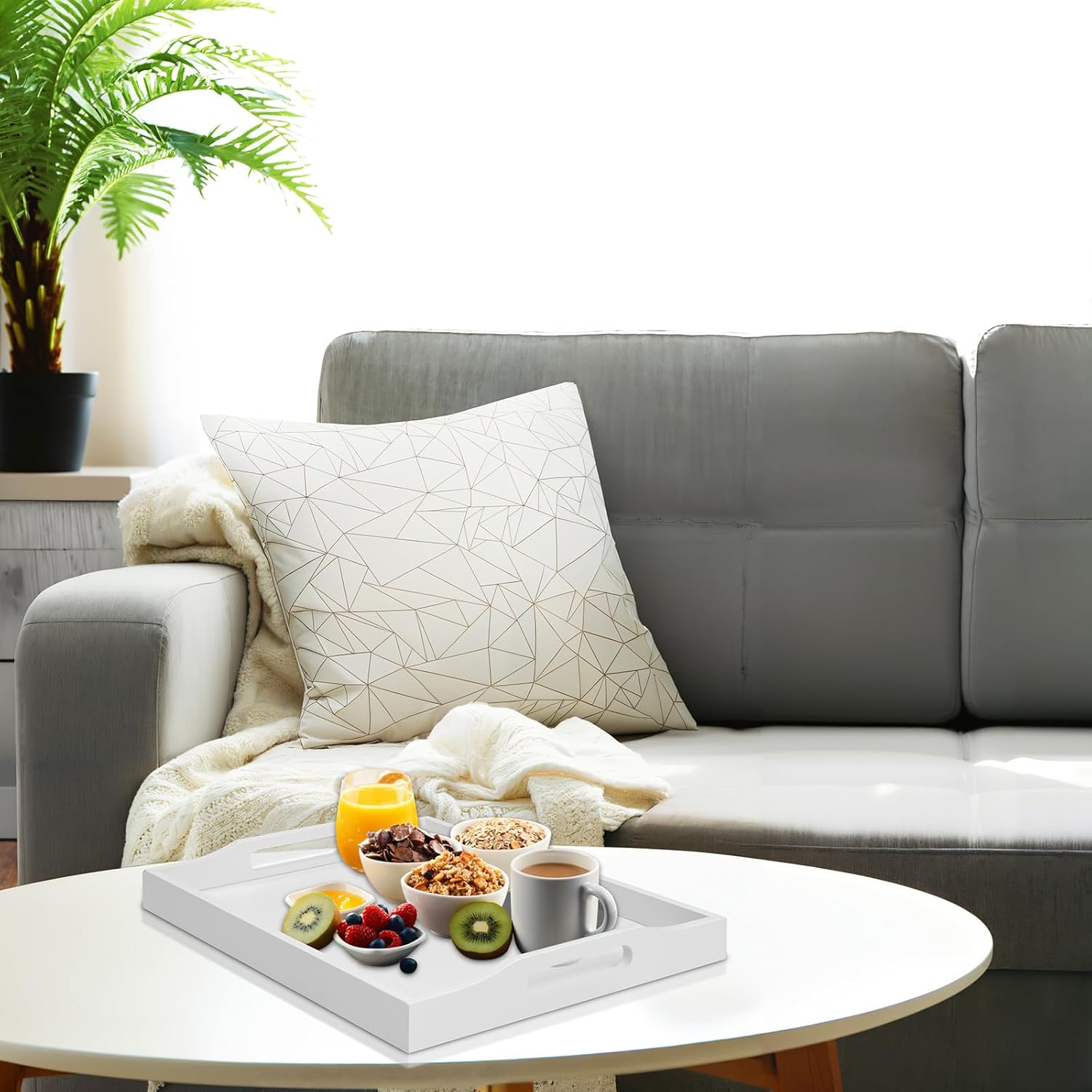 Bamboo Food Serving Tray with Handles, Breakfast Bed Tray for Tea,Snack,Dinner, Home Decorative Storage Food, Platter, Ottoman for Kitchen Counter, Bathroom, Restaurant (White)