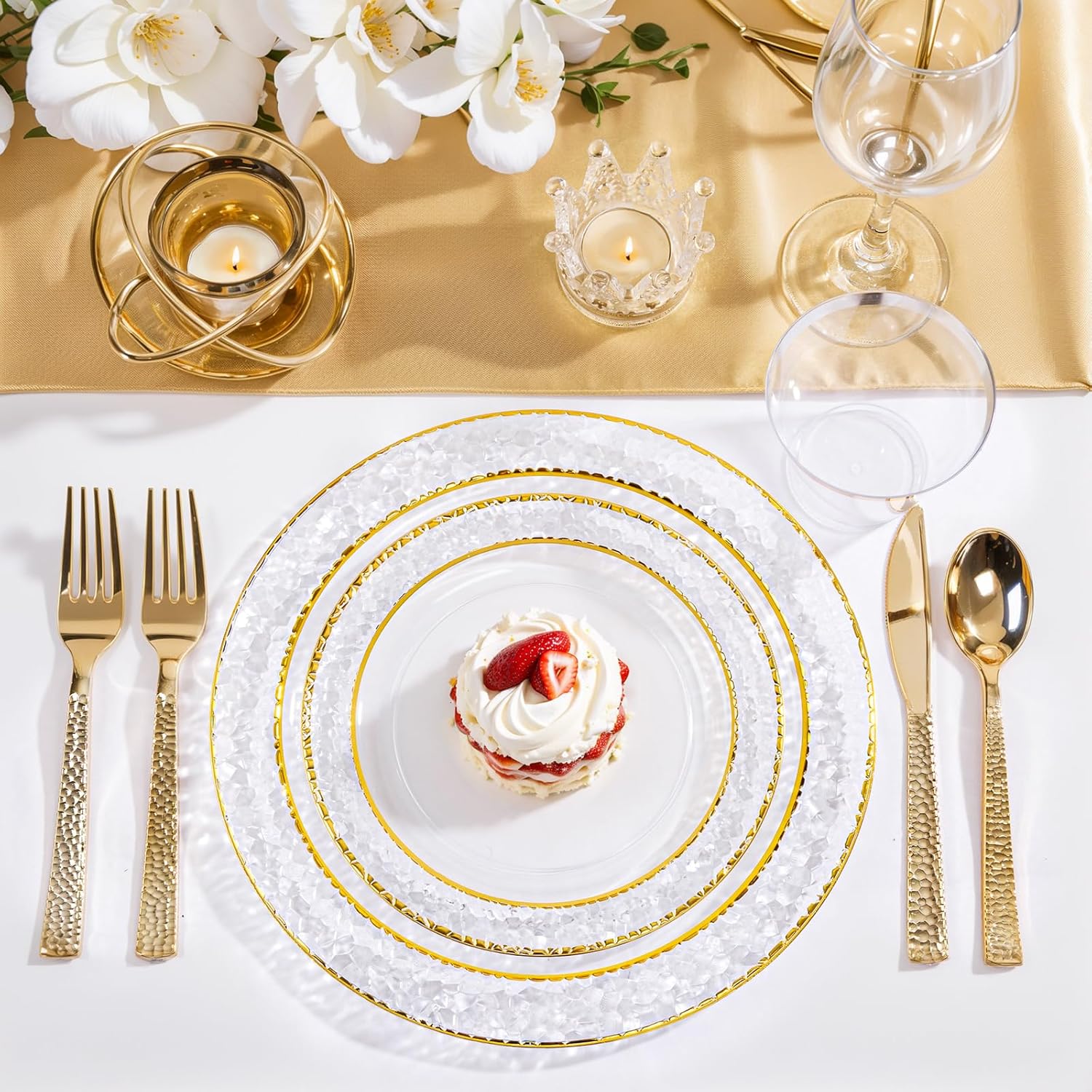 Nervure 150Pcs Clear Plastic Plates with Gold Hammered Silverware include 25Dinner Plate, 25Dessert Plate, 25Knives, 25Forks, 25Spoons and 25Cups for Wedding & Parties & Thanksgiving