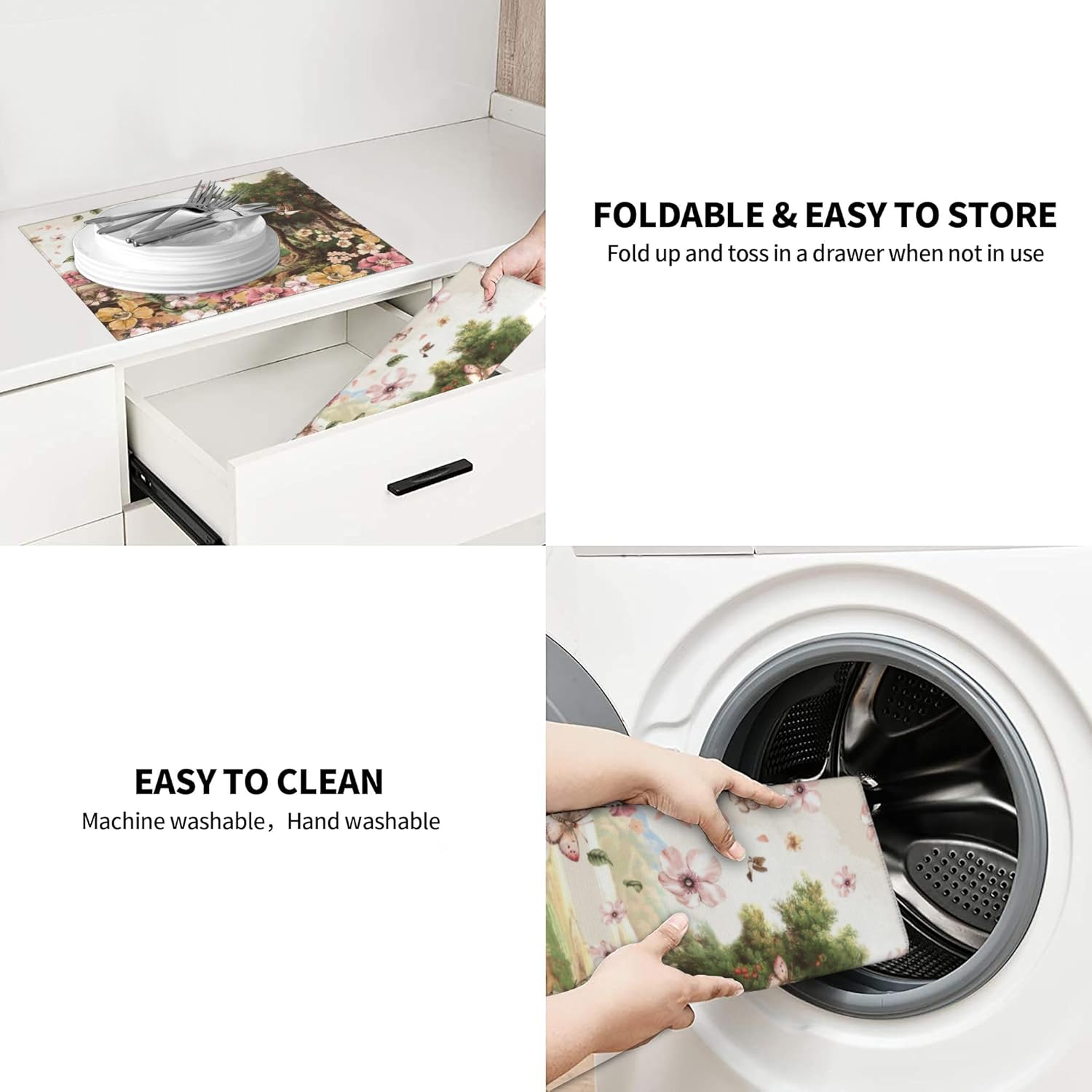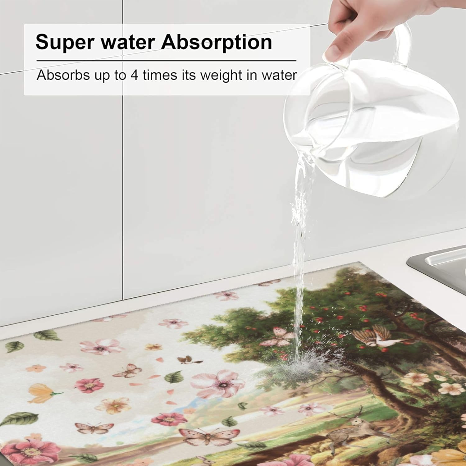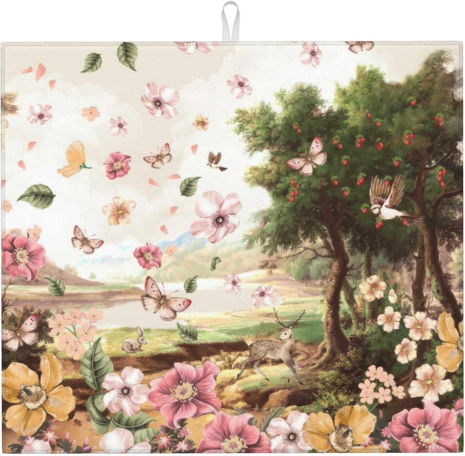 Retro Country Woods Deer Dish Drying Mat 16x18 Inch, Microfiber Absorbent Fast Dry Mat Flowers Butterfly Large Dish Mat Drying Kitchen Mat, Kitchen Drying Pad for Kitchen Counter Coffee Bar Decor