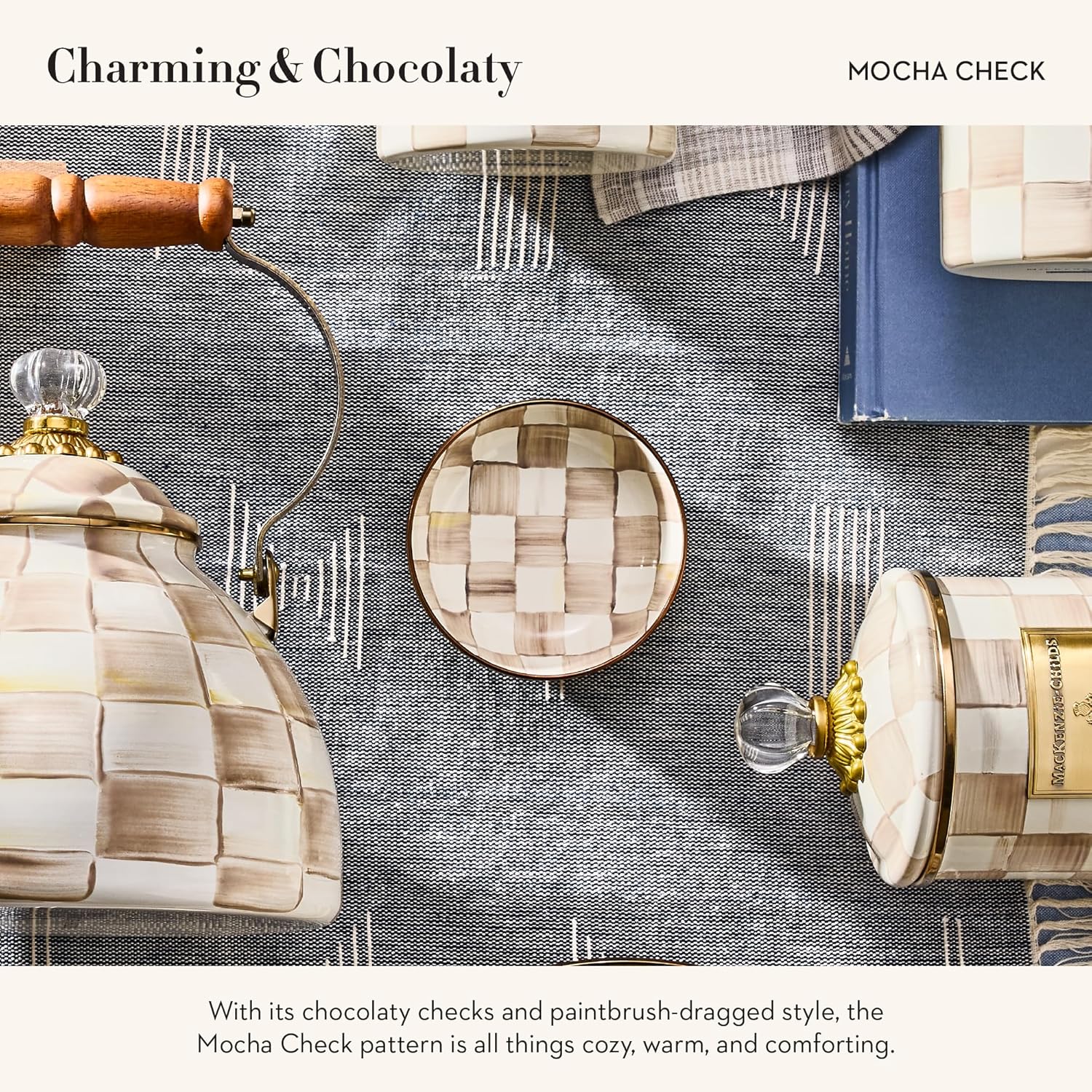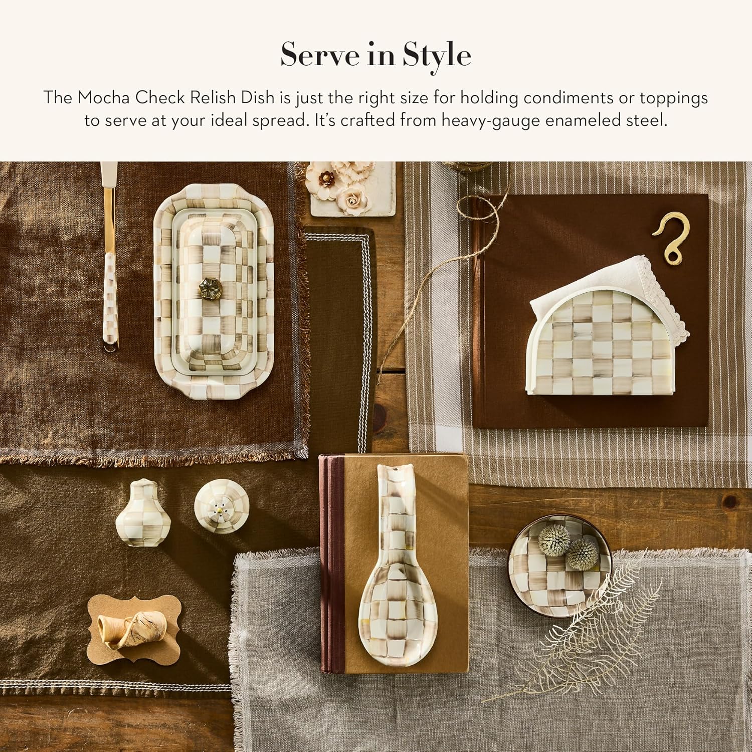 • ENTERTAINING ESSENTIAL: Elevate your serving dishes for every single snack or meal with our Mocha Check small bowl for relish. It features hand-painted, color-dragged brown-and-white checks on enameled steel and has a bronzed stainless-steel rim.