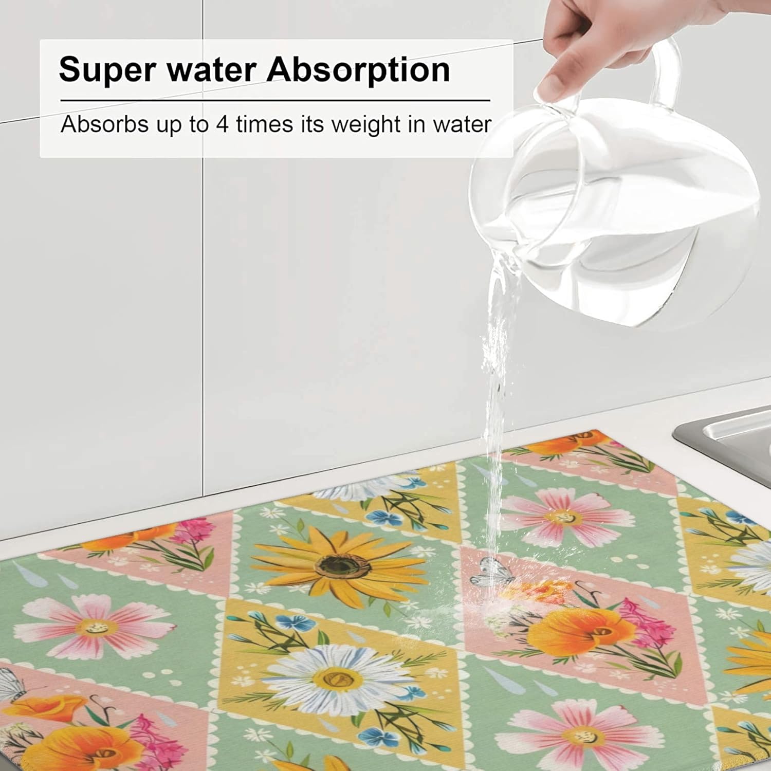 Daisy Flowers Dish Drying Mat 18x24 Inch, Microfiber Absorbent Fast Dry Mat Floral Large Dish Mat Drying Kitchen Mat, Kitchen Drying Pad for Kitchen Counter Coffee Bar Decor Gifts
