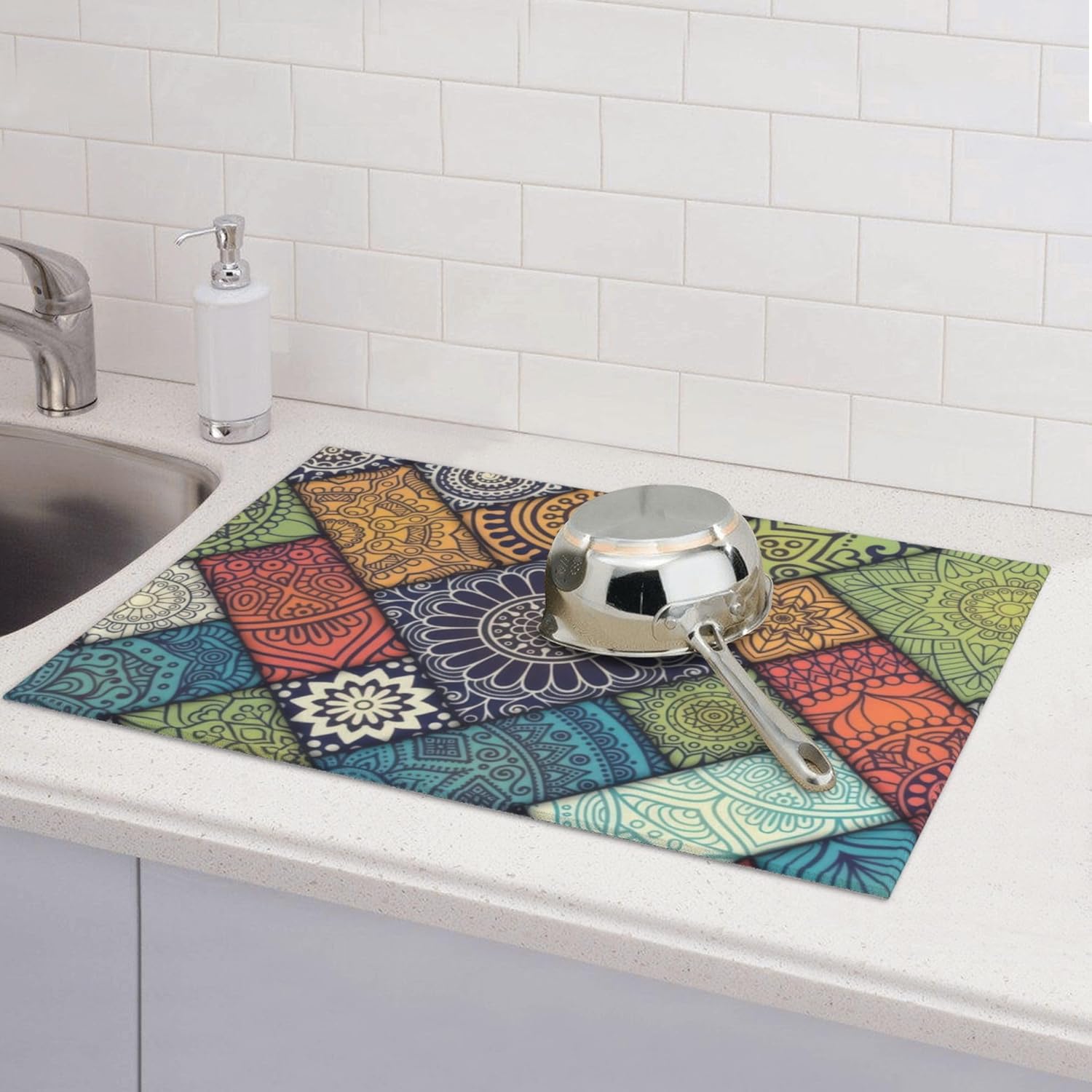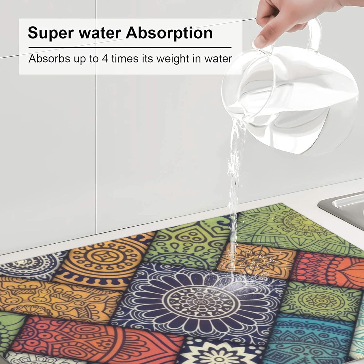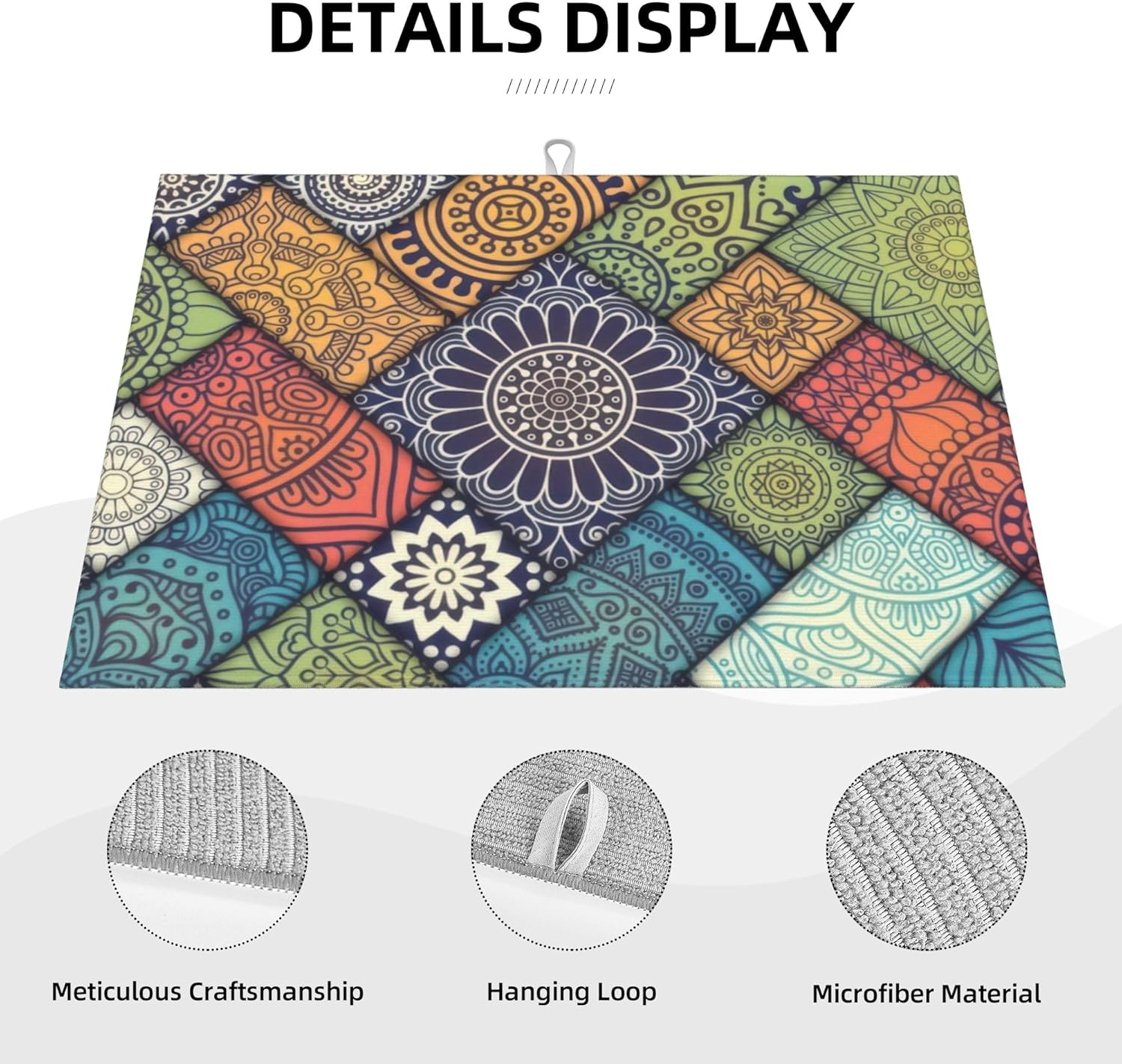 Retro Boho Dish Drying Mat 18x24 Inch, Microfiber Absorbent Fast Dry Mat Mandala Large Dish Mat Drying Kitchen Mat, Kitchen Drying Pad for Kitchen Counter Coffee Bar Decor Gifts