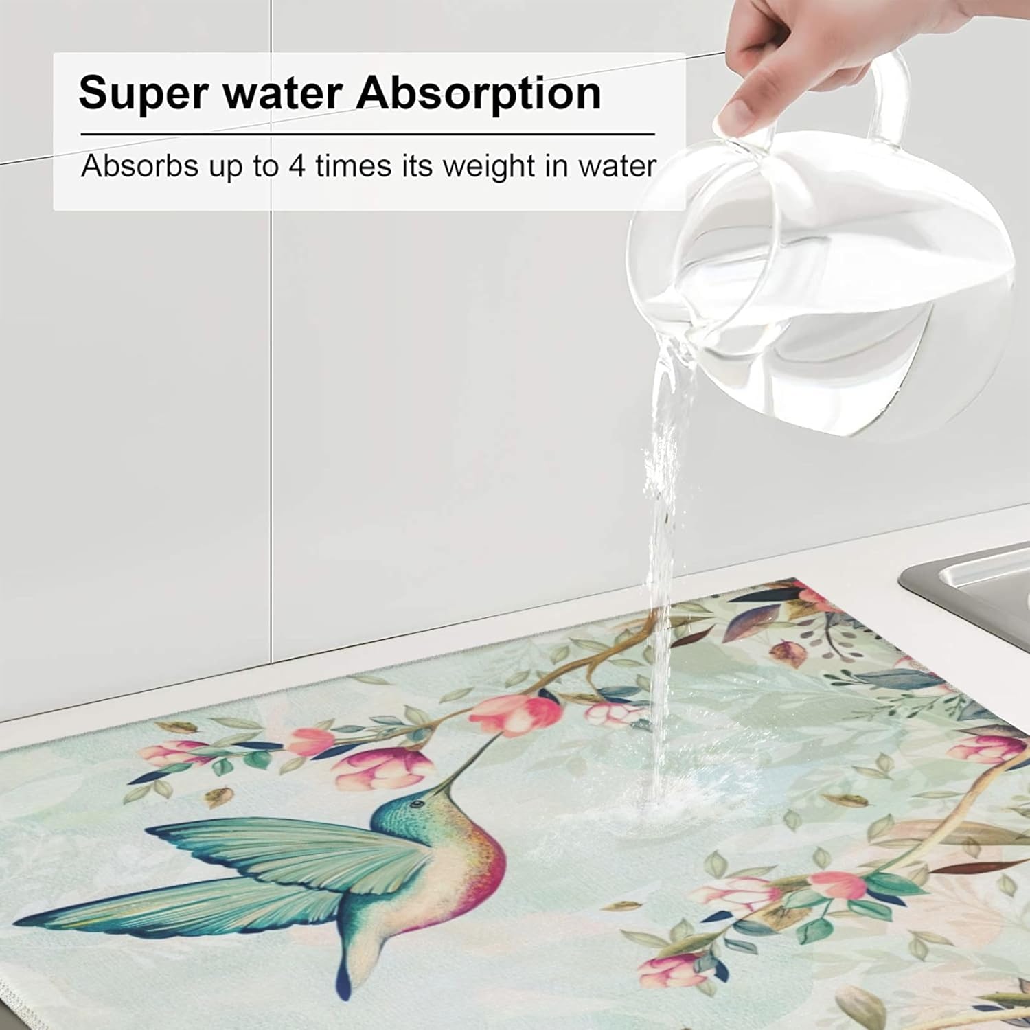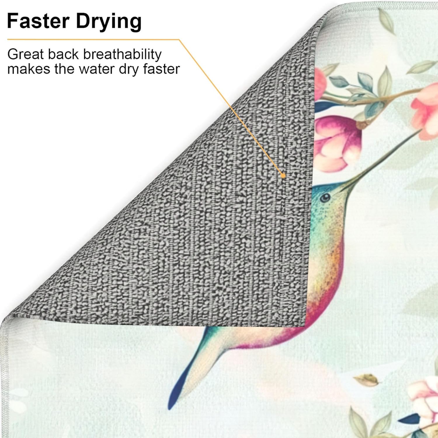 Hummingbird Flowers Dish Drying Mat 16x18 Inch, Microfiber Absorbent Fast Dry Mat Large Dish Mat Drying Kitchen Mat, Kitchen Drying Pad for Kitchen Counter Coffee Bar Decor Gifts