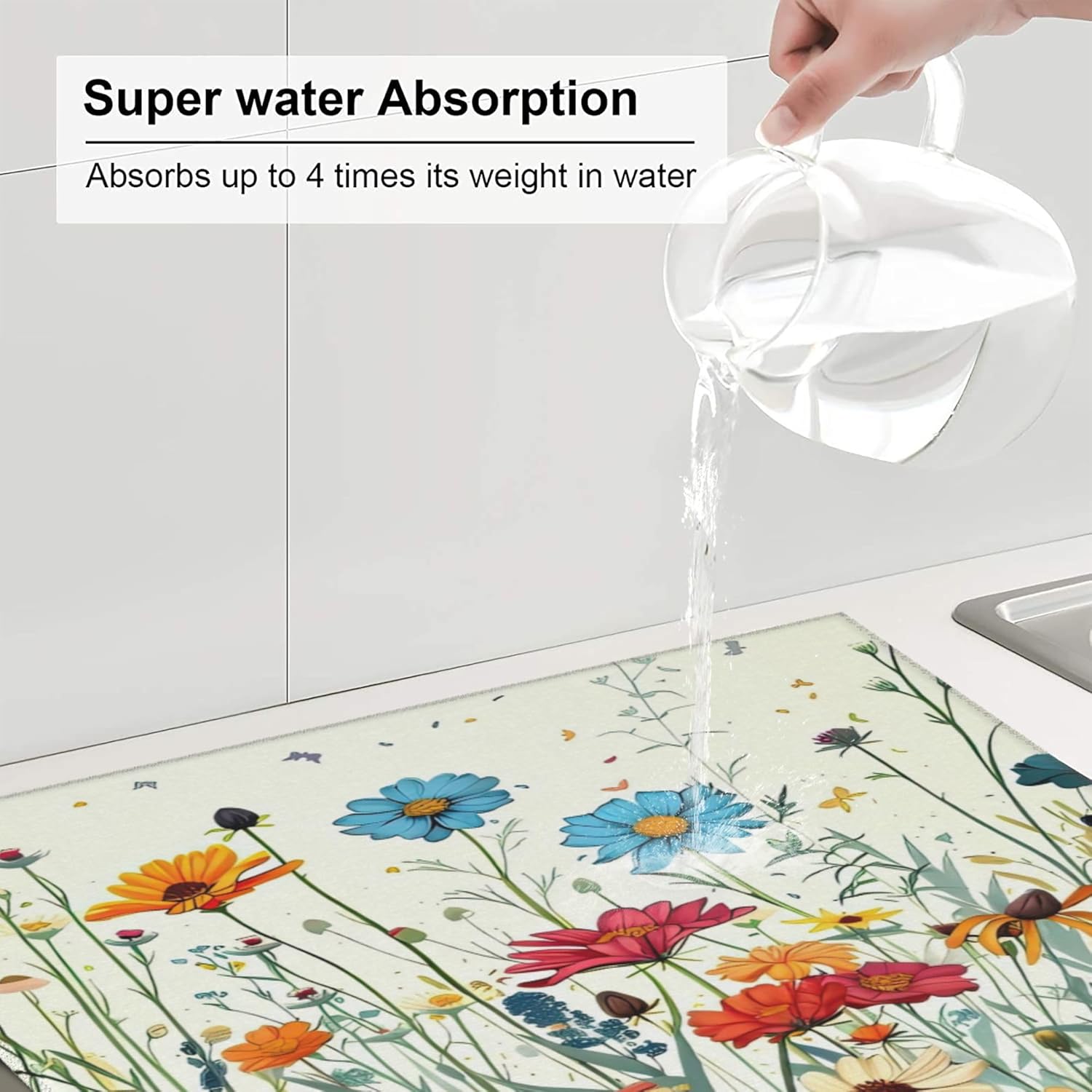 Butterfly Flowers Dish Drying Mat 16x18 Inch, Microfiber Absorbent Fast Dry Mat Daisy Floral Large Dish Mat Drying Kitchen Mat, Kitchen Drying Pad for Kitchen Counter Coffee Bar Decor Gifts