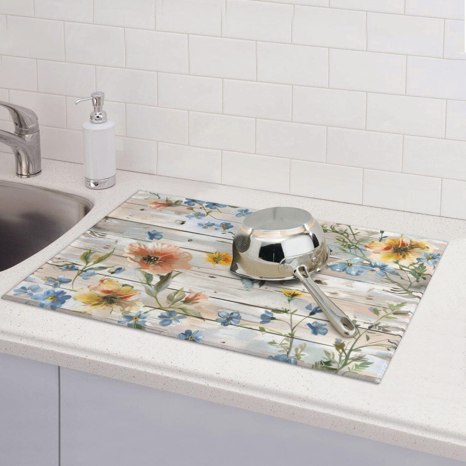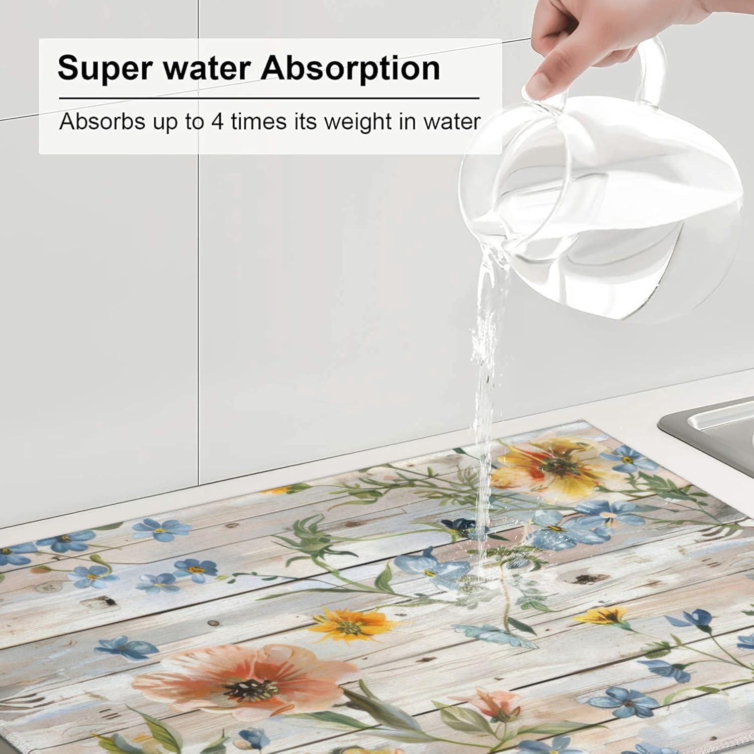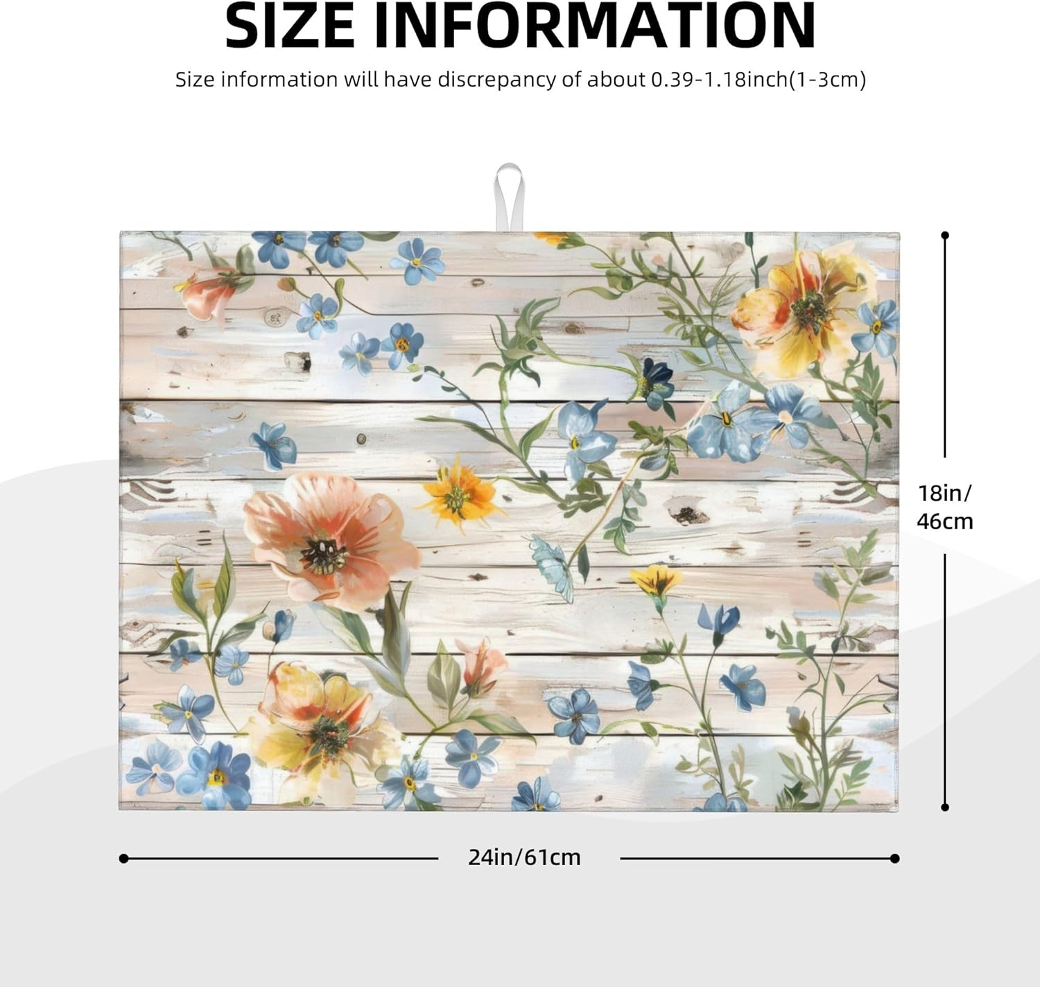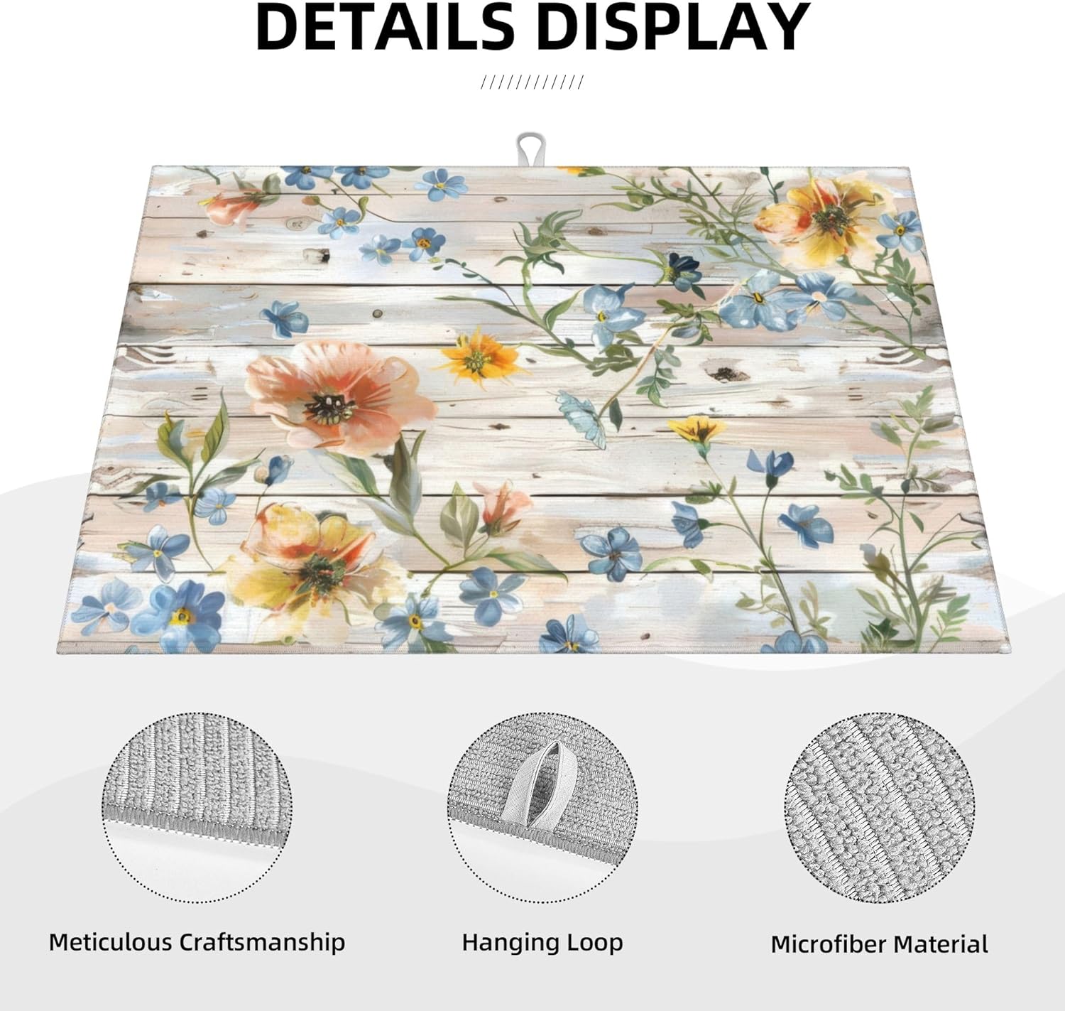 Flowers on Wooden Board Dish Drying Mat 18x24 Inch, Microfiber Absorbent Fast Dry Mat Floral Large Dish Mat Drying Kitchen Mat, Kitchen Drying Pad for Kitchen Counter Coffee Bar Decor Gifts