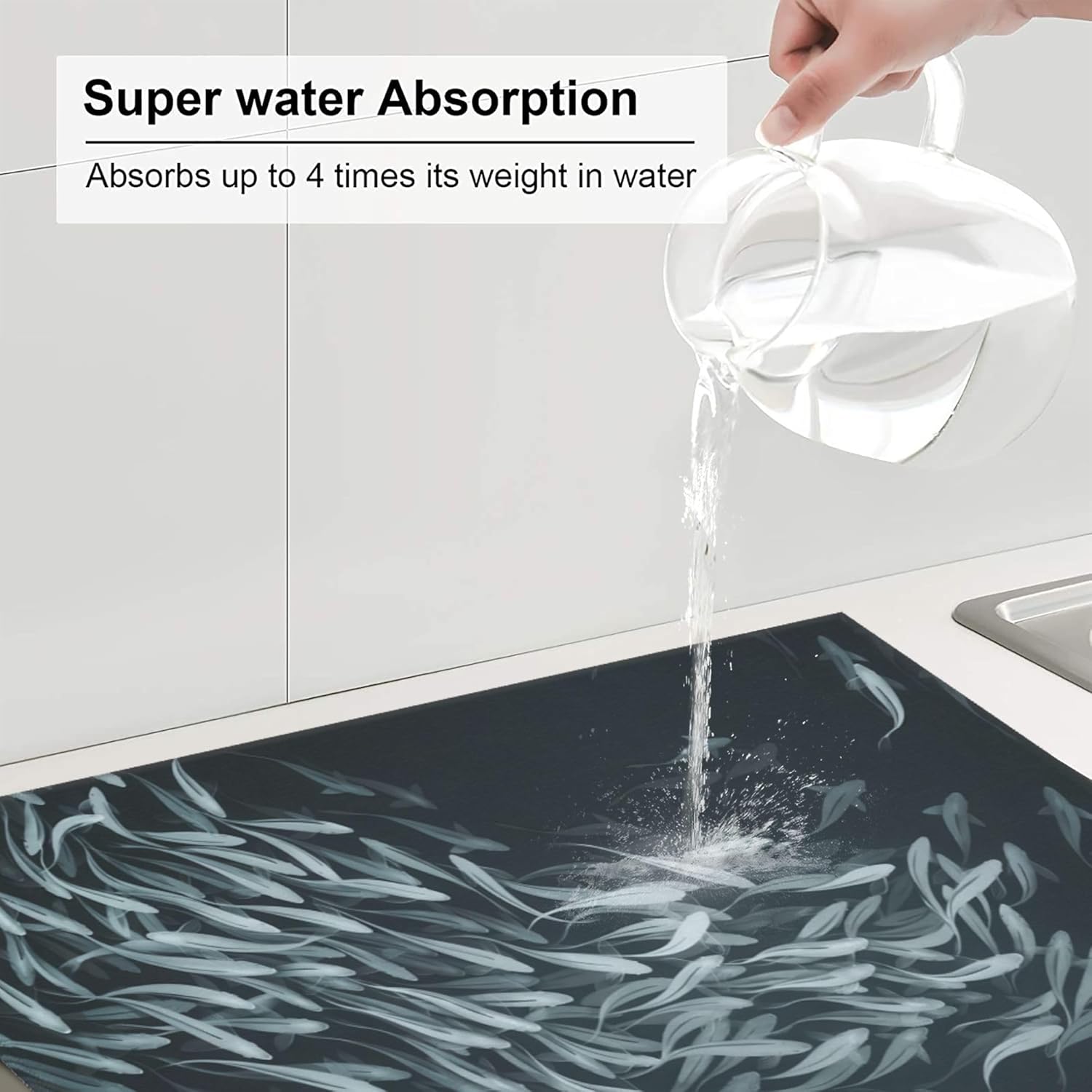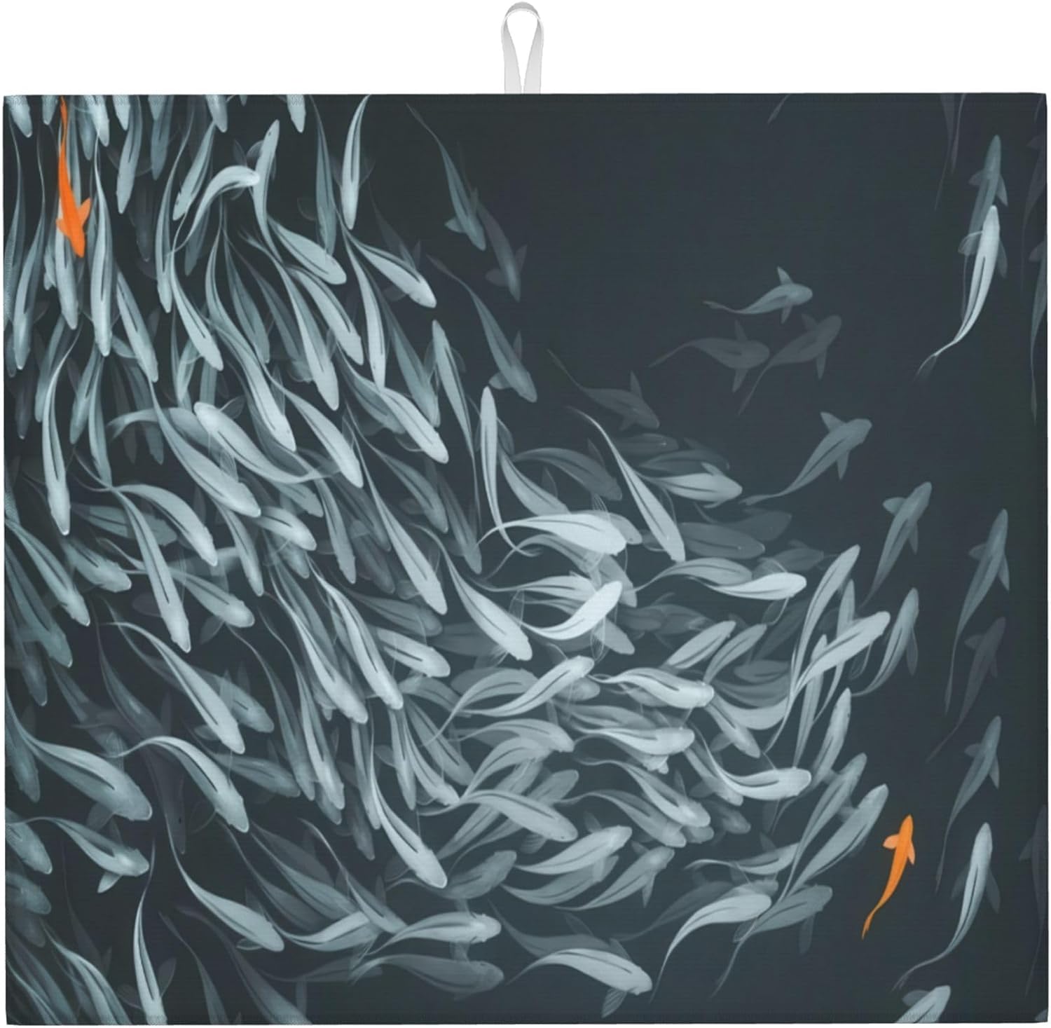 Japanese Fish Dish Drying Mat 16x18 Inch, Microfiber Absorbent Fast Dry Mat Artistic Painting of Fish Large Dish Mat Drying Kitchen Mat, Kitchen Drying Pad for Kitchen Counter Coffee Bar Decor