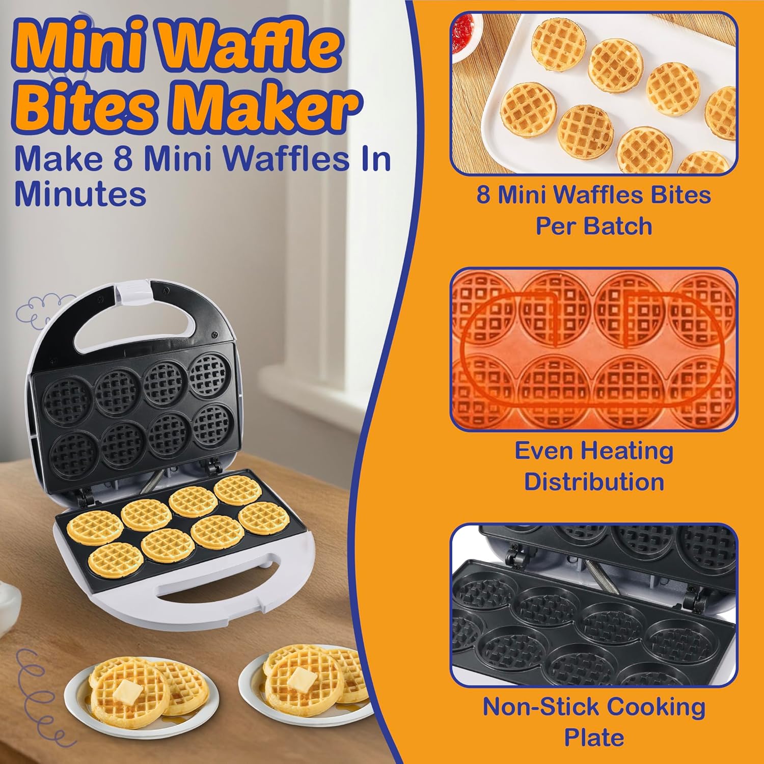 • 8 DELICIOUS WAFFLE BITES IN MINUTES: Whip up 8 perfectly golden 2-inch waffle bites at once with 750W of fast-heating power—ideal for quick breakfasts, kid-friendly snacks, or party treats.