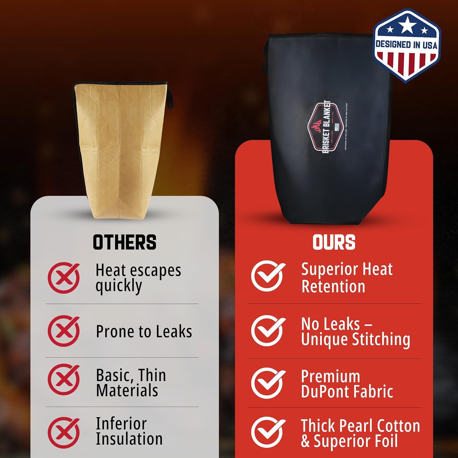 • ✅ Leak-Resistant & Durable for Mess-Free BBQ Unlike other meat resting bags, Brisket Blanket is made with premium Tyvek material and a durable foil lining to prevent leaks and withstand heavy use. Whether you're resting a juicy brisket or smoked pork, your prep area stays clean. Made with a rugged exterior and heat-reflective liner, this heavy-duty meat resting blanket is built to last. It’s washable and reusable, so it replaces disposable foil and old towels as a more effective BBQ accessory.