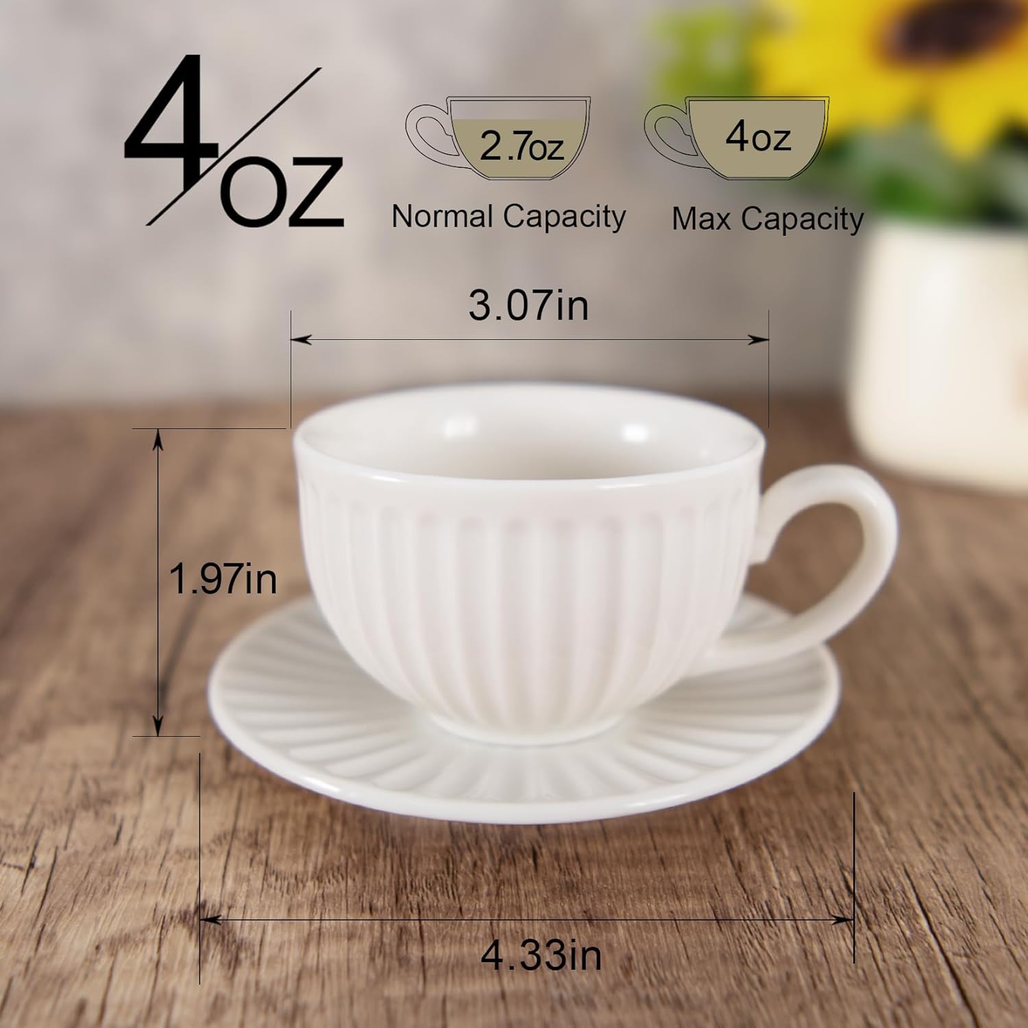 4 oz White Espresso Cups Set of 2, Ceramic Cappuccino Cups with Saucers, Durable Porcelain Tea Set & Modern Coffee Cup Collection, Coffee Lover Gifts