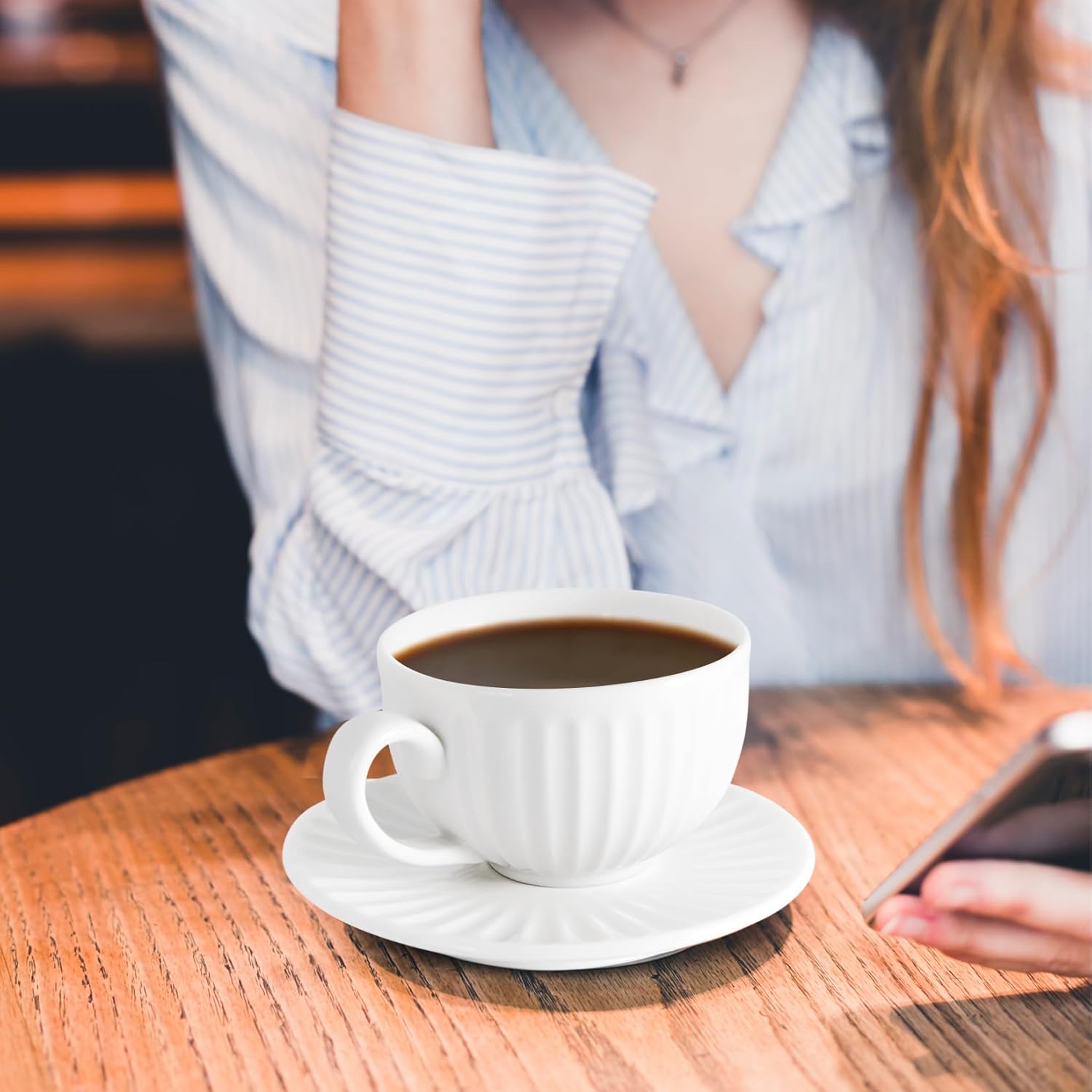 • Premium Durability Meets Everyday Luxury: Made from high-quality porcelain, this cappuccino cup set resists chipping, staining, and thermal shock, making it ideal for daily use. The ceramic espresso cups feature a smooth, non-porous surface that’s dishwasher-safe for effortless cleanup. Each coffee cup with saucer boasts a balanced weight and ergonomic handle, ensuring comfort during long conversations or quick caffeine boosts.