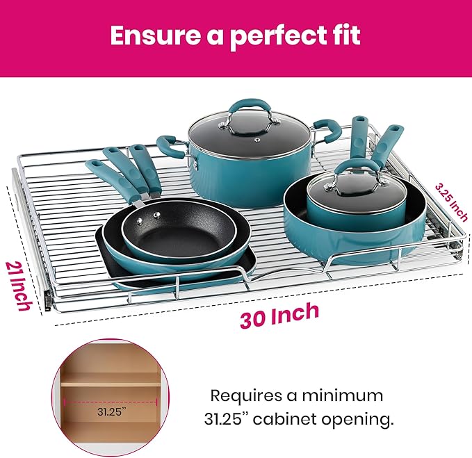 • EASY TO INSTALL & HARDWARE INCLUDED: Our pull out cabinet organizer dimensions measure 30”W x 21”D x 3.15” and includes simple step-by-step instructions along with all of the hardware necessary for easy installation. Installs with just a few simple screws, and Fits cabinet openings 31-1/4”and larger.