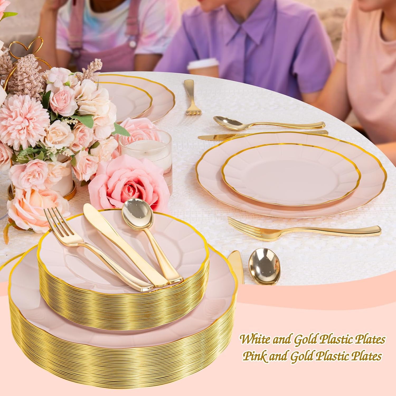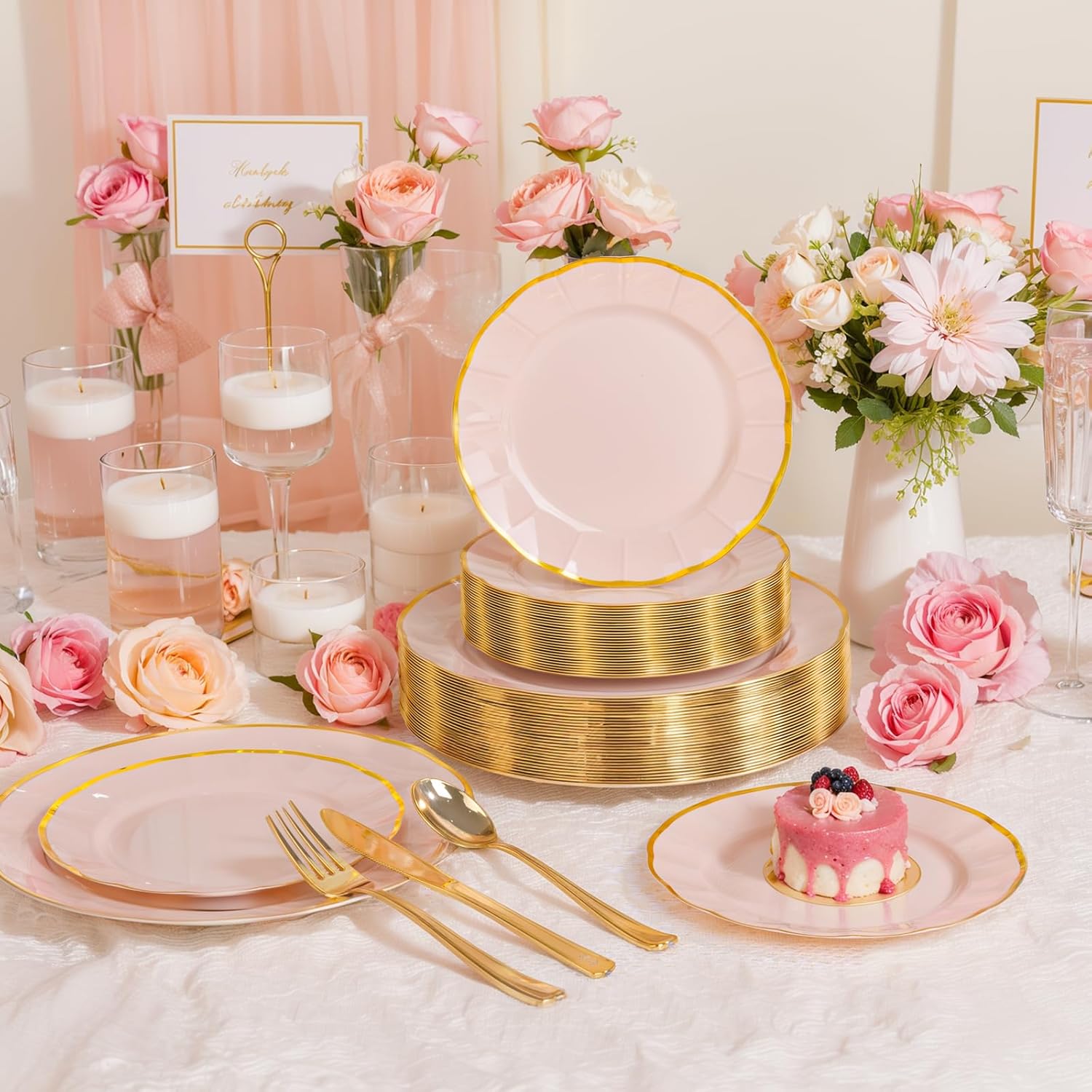 EI 150pcs Pink Plastic Plates with Gold Plastic Silverware,Pink Party Plates,Heavy Duty Plate Disposable,Gold Dinnerware Set for Birthday, Afternoon Tea,Wedding