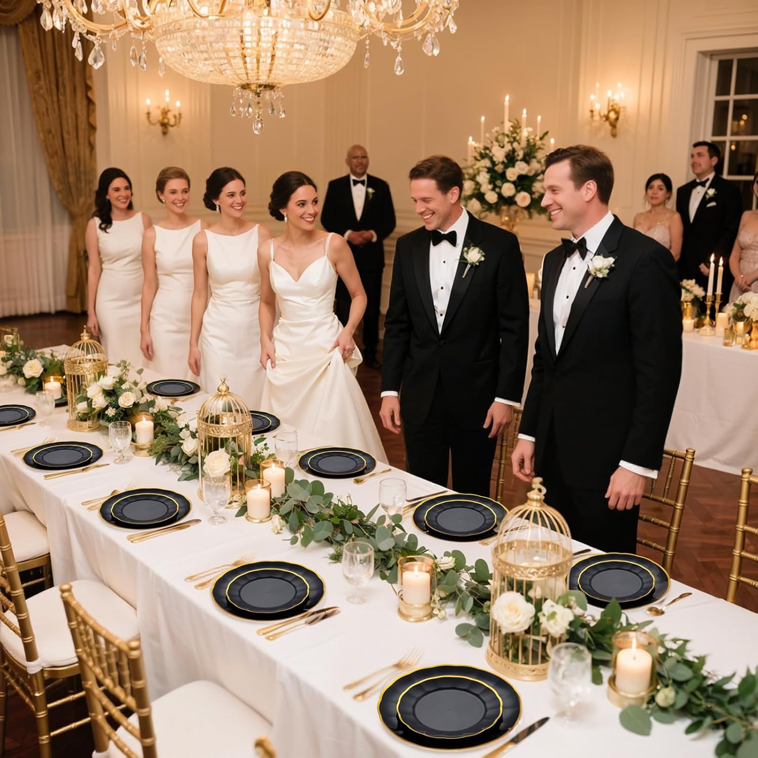 • Stunning & Distinctive Designs:Our newly designed black plates inlaid with gold rimmed,presenting a very elegant design.Paired with gold plastic dinnerware,they exude an air of refinement.These unique plastic plates and sliverware make any occasion appear elegant.