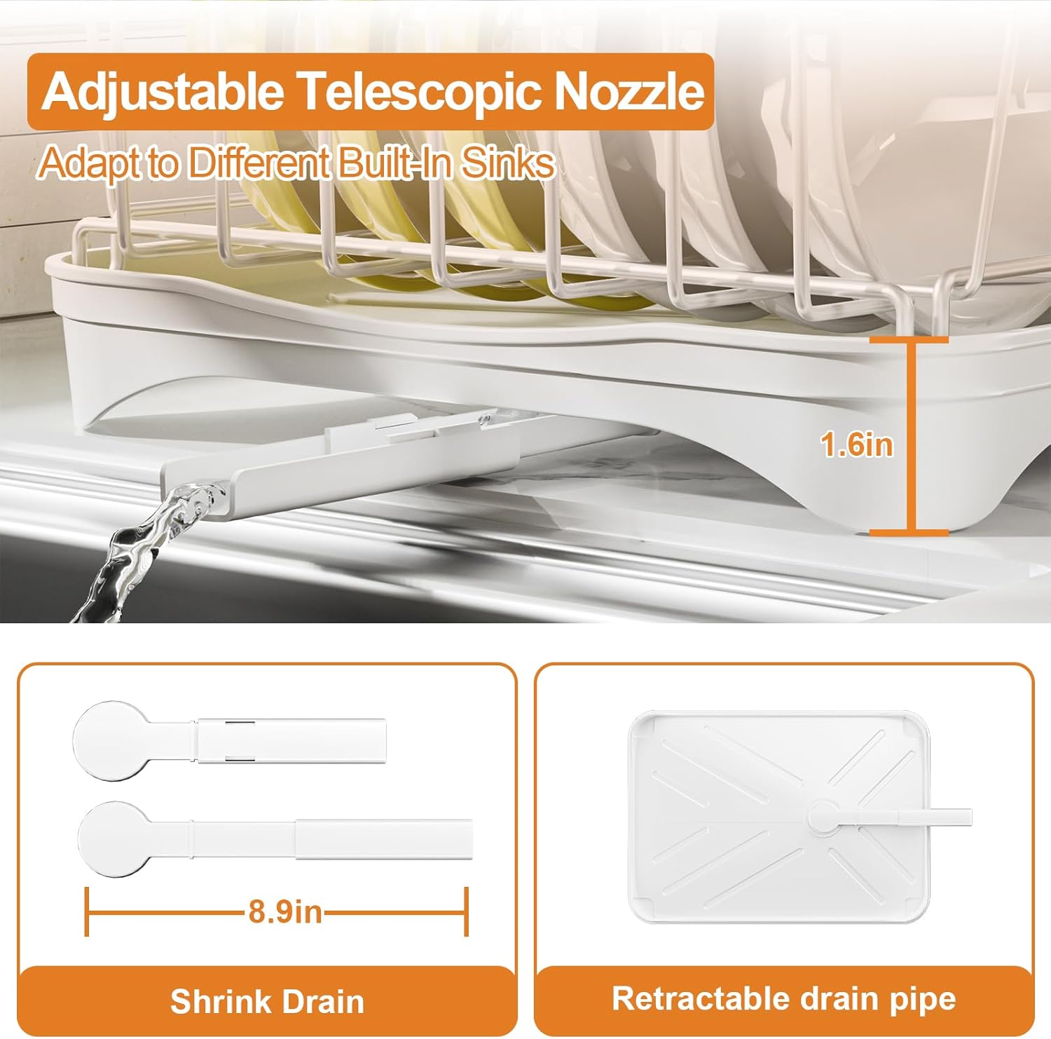 • Automatic Drainage & Non-Wet Countertop: Drying rack for dishes is equipped with hourglass-shaped drainer tray with built-in water channel and adjustable retractable dish drains, dish drainers for kitchen counter to quickly drain water into the sink