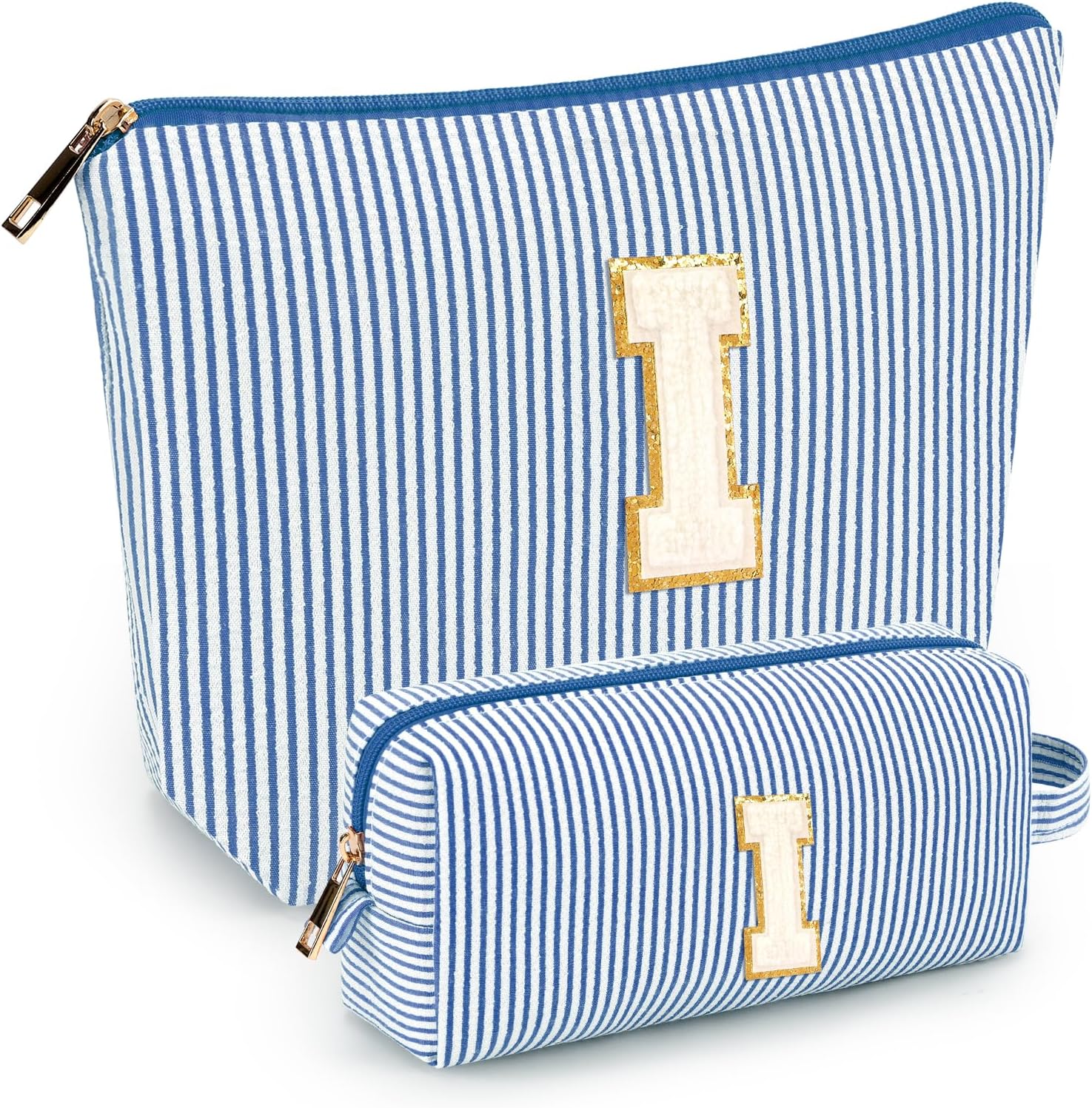 2 PCS Initial Makeup Bags for Women: Cosmetic Bag for Travel Toiletry - Birthday Gifts for 11 12 13 14 15 16 17 18 Years Old Girl Graduation Teacher Gift- Teen Girl Gifts Trendy Stuff - Blue I